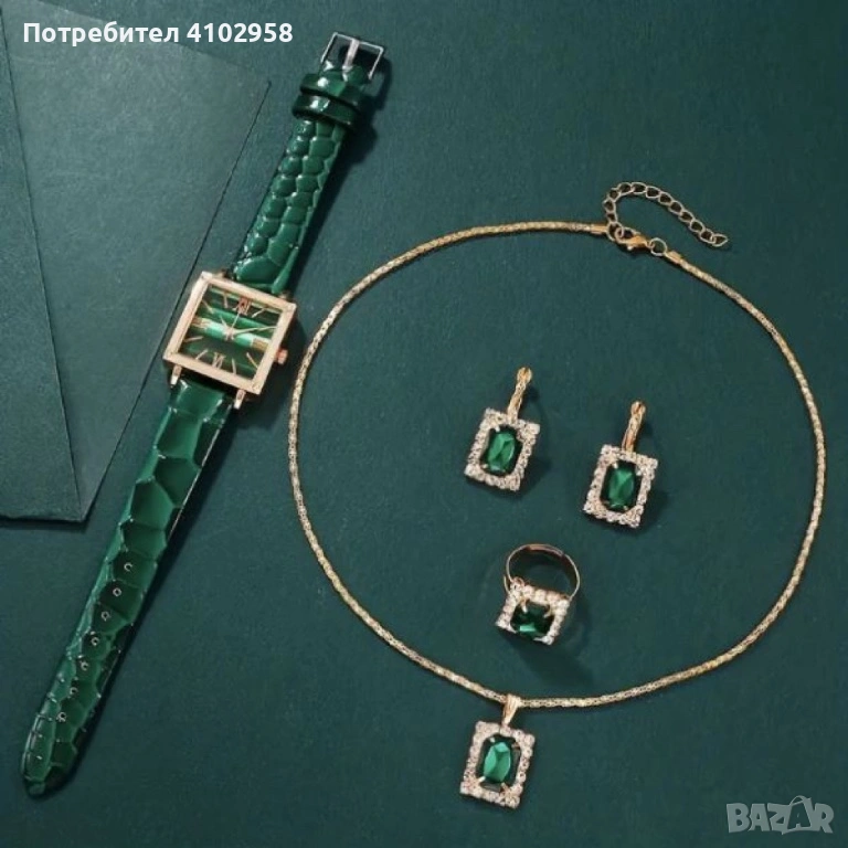 Елегантен комплект часовник и бижута с зелени кристали и златист корпус → Обява 53124213