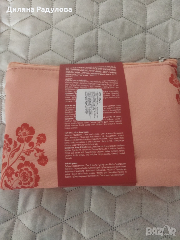 Козметичен комплект, включващ душ гел 100 мл., лосион за тяло 100 мл. с аромат на нероли и иланг иланг, крем за ръце 70 мл. и мрежеста гъба за баня и платнен несесер с цип.