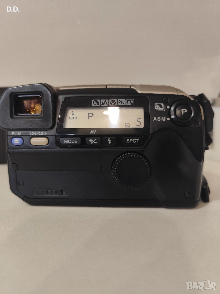 Здравейте, продавам тази Минолта, която работи с APS филм. До колкото знам този формат не се произвежда вече, но тук таме изскачат някакви бройки. Във фотоапарата има филм с 5 оставащи снимки.