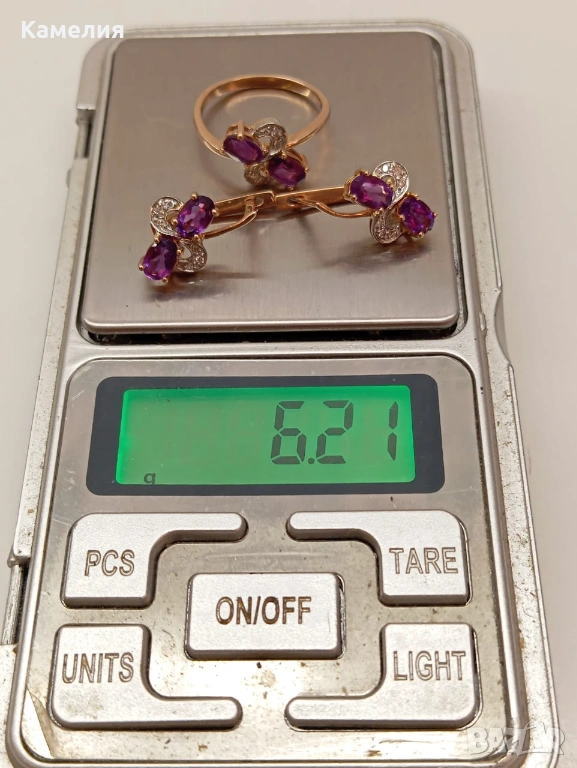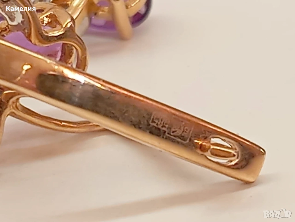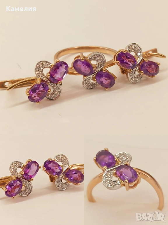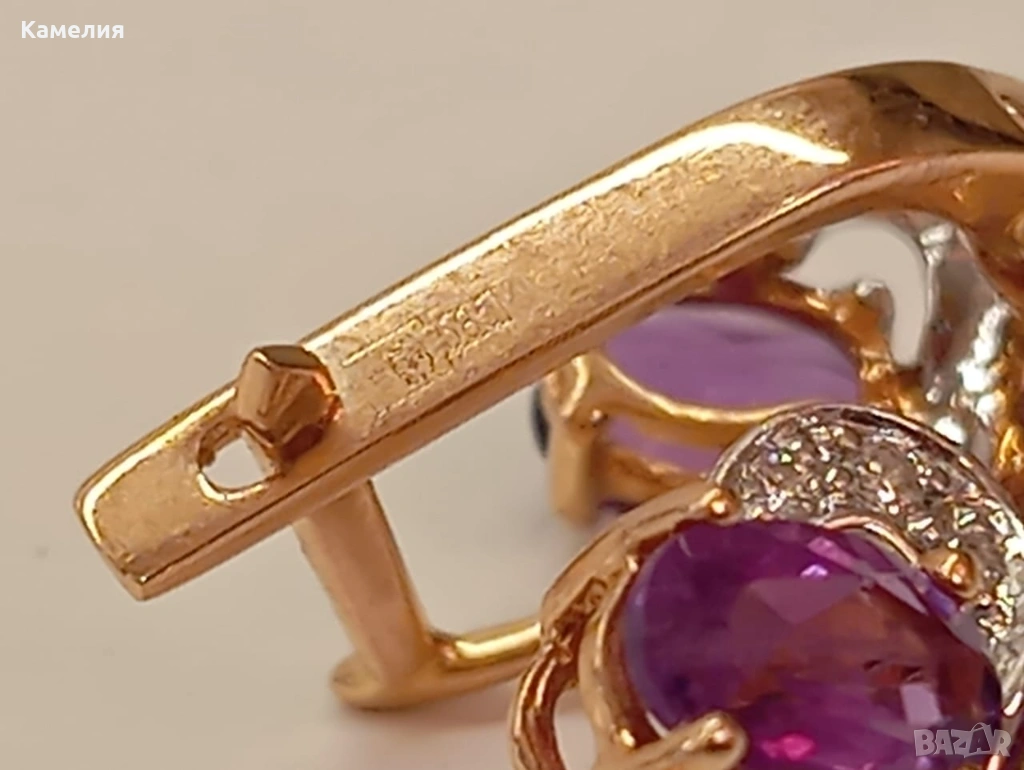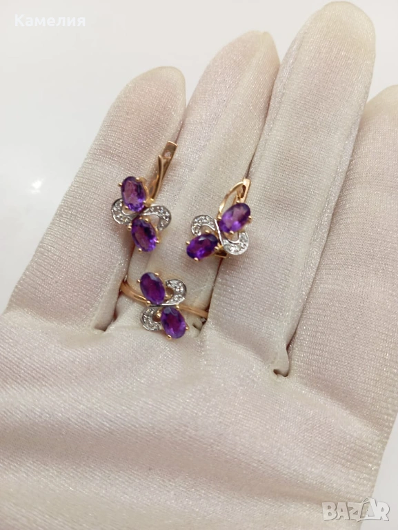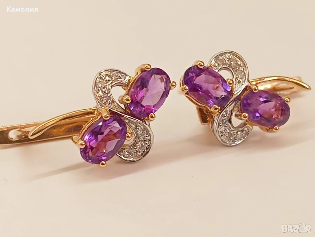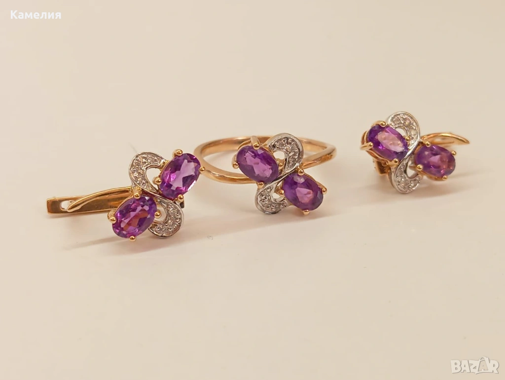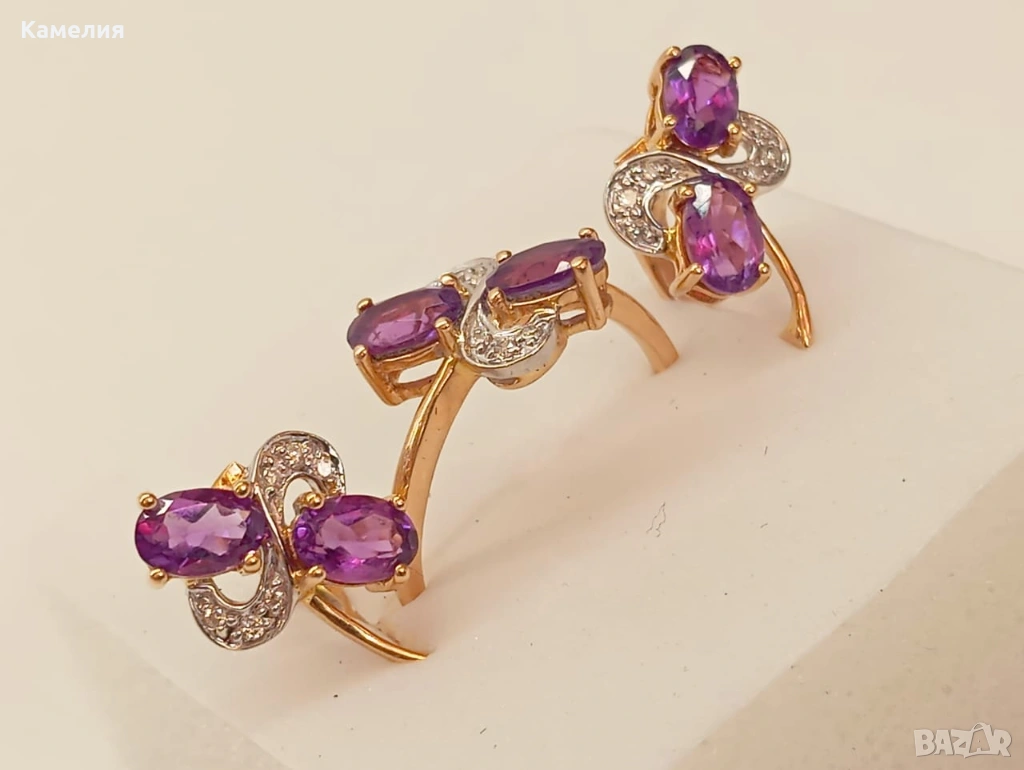 Руски златен комплект с брилианти и аметисти обеци и пръстен . Проба 585 глава с кокошник. Грамаж 6,21 грам. Диаметър на пръстена 18 мм.