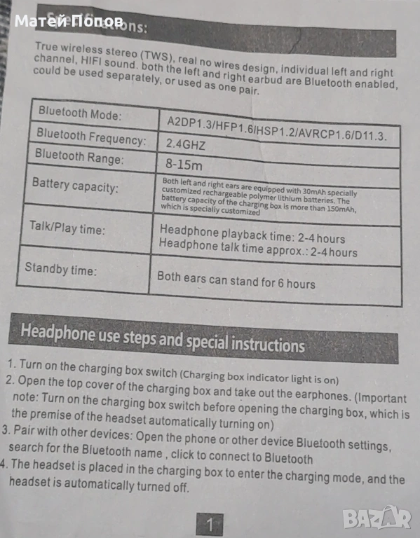 Време за възпроизвеждане със слушалки: 2-4 часа. Приблизително време за разговор със слушалки: 2-4 часа.