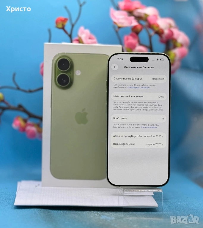Продавам Apple iPhone 17, 256GB, 5G, Sage в перфектно състояние – неразличим от нов. Телефонът е купен преди дни (на една от снимките се виждат циклите на зареждане), без абсолютно никакви забележки, драскотини или следи от употреба. Работи безупречно и всички функции са напълно изправни. Закупен е на 07/01/2026 г. и е с остатъчна гаранция до 2029 г., което го прави отлична и сигурна покупка за човек, който иска нов телефон, но на по-добра цена.