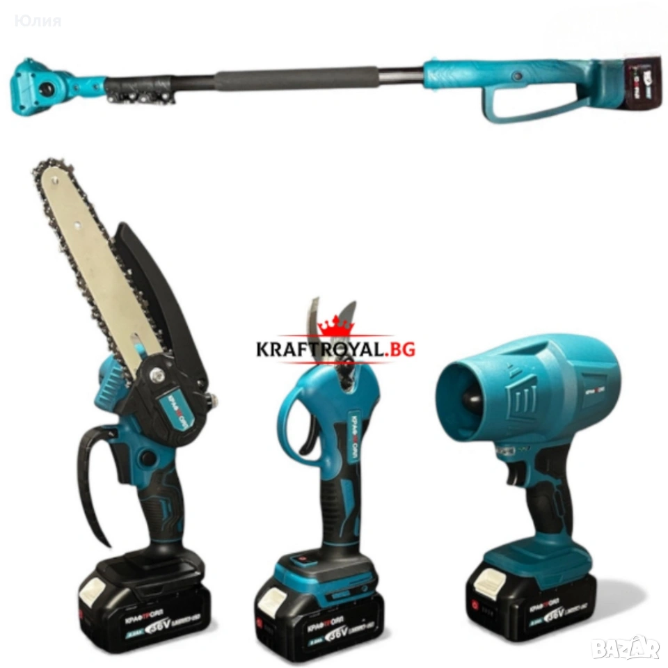 Акумулаторен комплект 4в1 KraftRoyal – Лозарска ножица, мини верижен трион 15 см, духалка и телескопичен прът Материал / корпус: подсилен ABS + метални елементи за стабилност; Батерии: 2 × 36V / 8.0Ah, литиево-йонни (включени в комплекта); Зарядно устройство: 36V, включено; Режеща шина: 15 см, мини верижен трион; Верига: включена; Лозарска ножица: отваряне 54 мм, капацитет рязане 33 мм; Телескопичен прът: регулируем до 2 м; Турбо пистолет (духалка): компактен, висок въздушен дебит; Допълнителни елементи: тубичка за масло, инструмент за сглобяване, резервен корпус; Съвместимост: всички приставки работят с батериите от комплекта; Сертификации / безопасност: CE, 3C, GS.