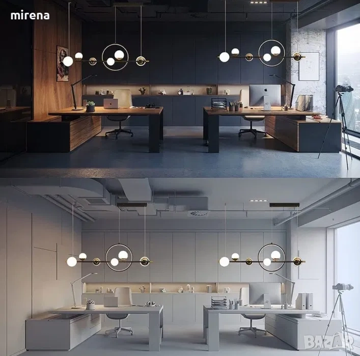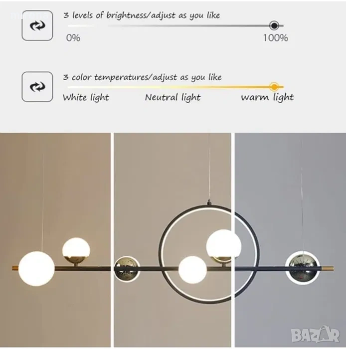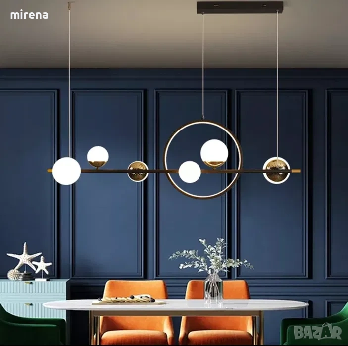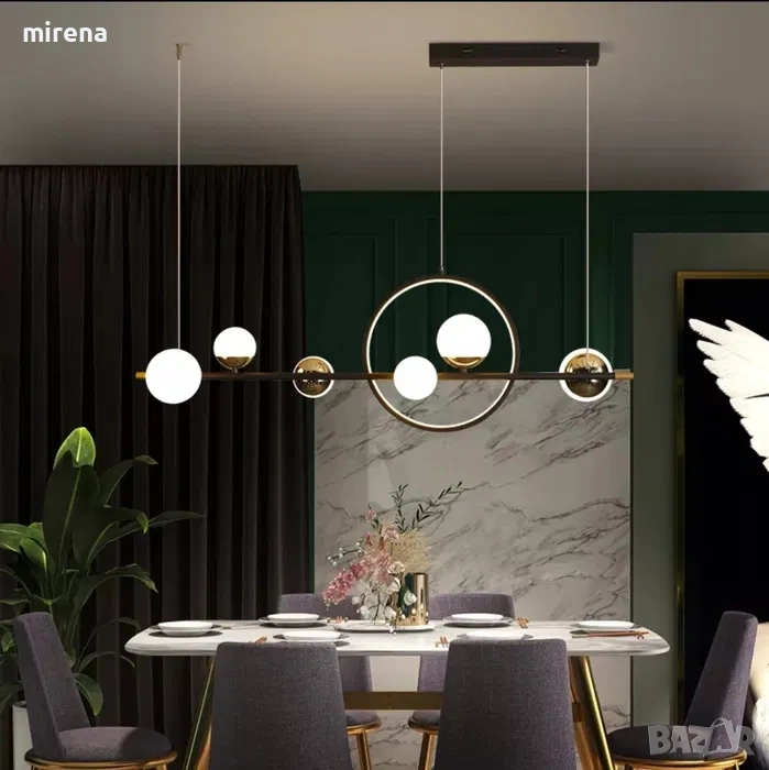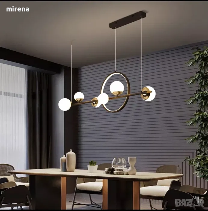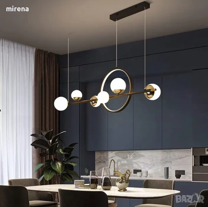 Размер: L112 × B27 см, Тип на източника на светлина: LED, Мощност: 66 W (5280 lm). Напрежение: 11 0V-240V. Тел за окачване: 100 см регулируема височина, комбинацията от прът и пръстен показва геометричните елементи на тази лампа, идеална за използване в трапезарията.