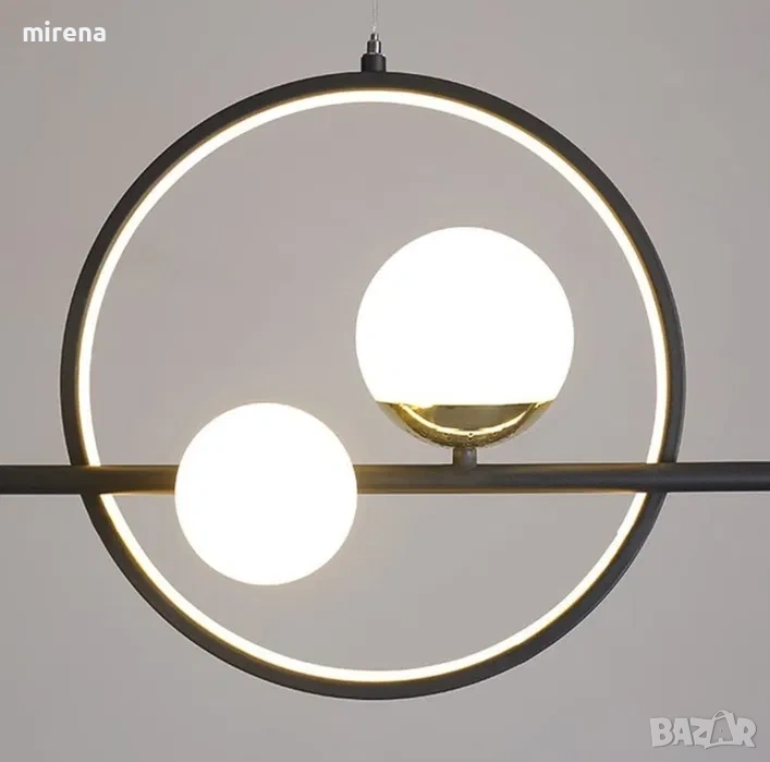 Модерно висящо осветително тяло с LED лампи, подходящо за трапезария или хол. Елегантен дизайн с кръгли форми и метални акценти, създаващ уютна и стилна атмосфера.