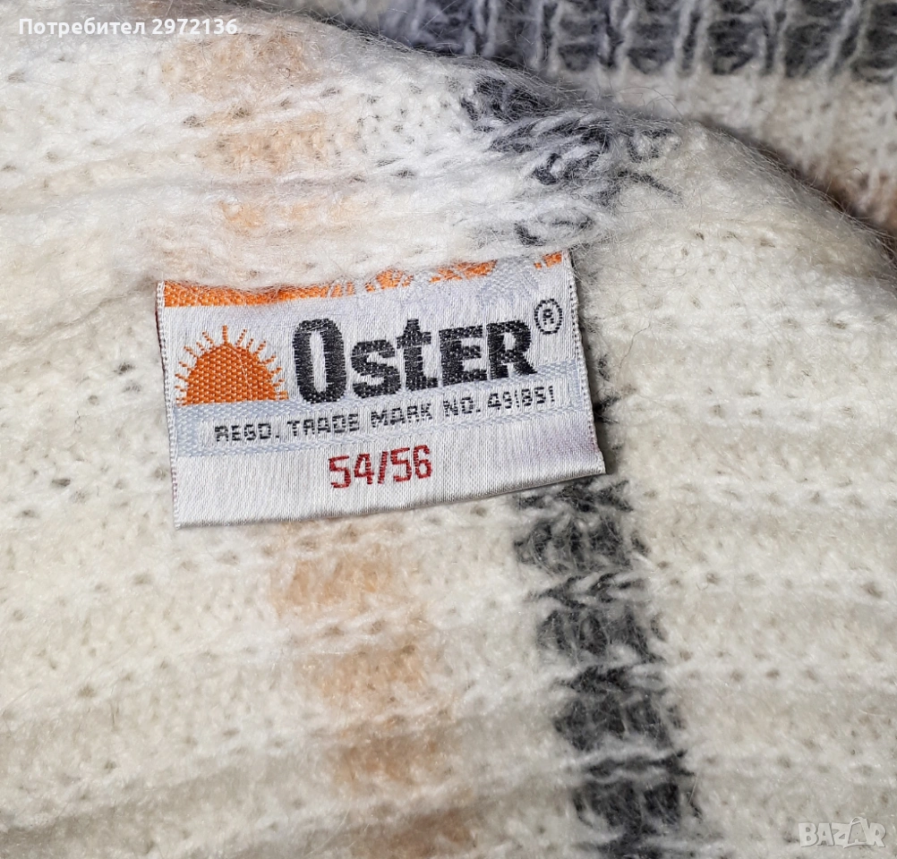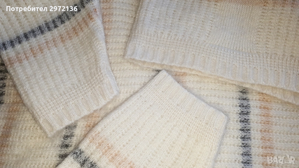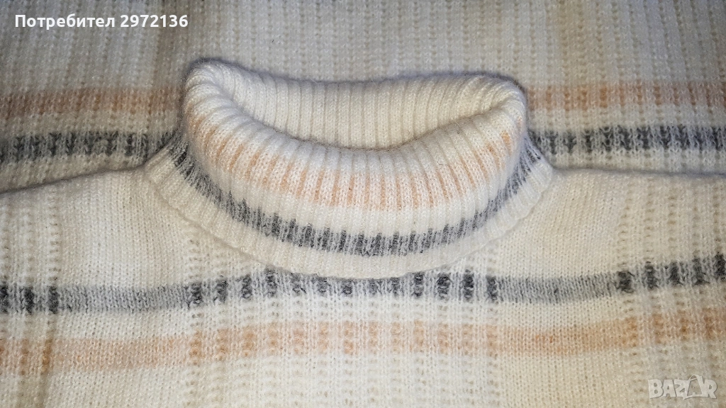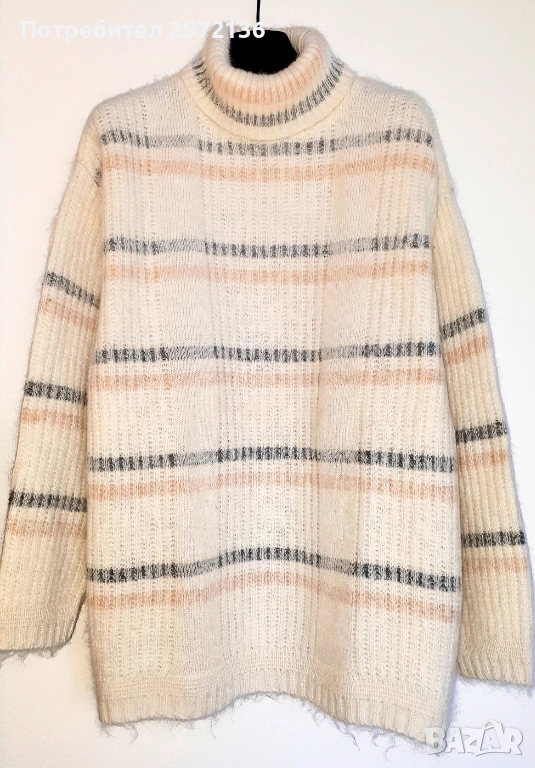 Дамски дълъг есенно-зимен пуловер с широка поло яка. Цвят бял/крем с бледи райета в сиво и нежно бежово. Права кройка с широк ръкав и свободна ръкавна извивка. Съединителните шевове не са рязани. Яката поло е свободна, не е прилепнала по врата. Пуловерът е подходящ за стройни и високи дами, но стои отлично и на по-пълни фигури. Размери в неразтеглено състояние: дължина от врата 74 см, ширина гръдна 114 см, дължина на ръкава от вратната извивка 74 см, дължина на яката 18 см. Размер по етикет 54/56. Състав: мека вълна и мохер без синтетика. Тегло 750 гр. Пуловерът е нов, неупотребяван, без хартиен етикет. Наличен само този, който виждате на снимката.