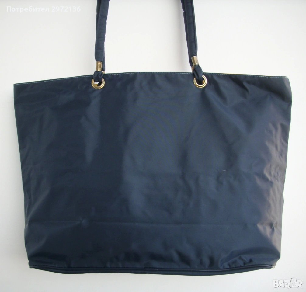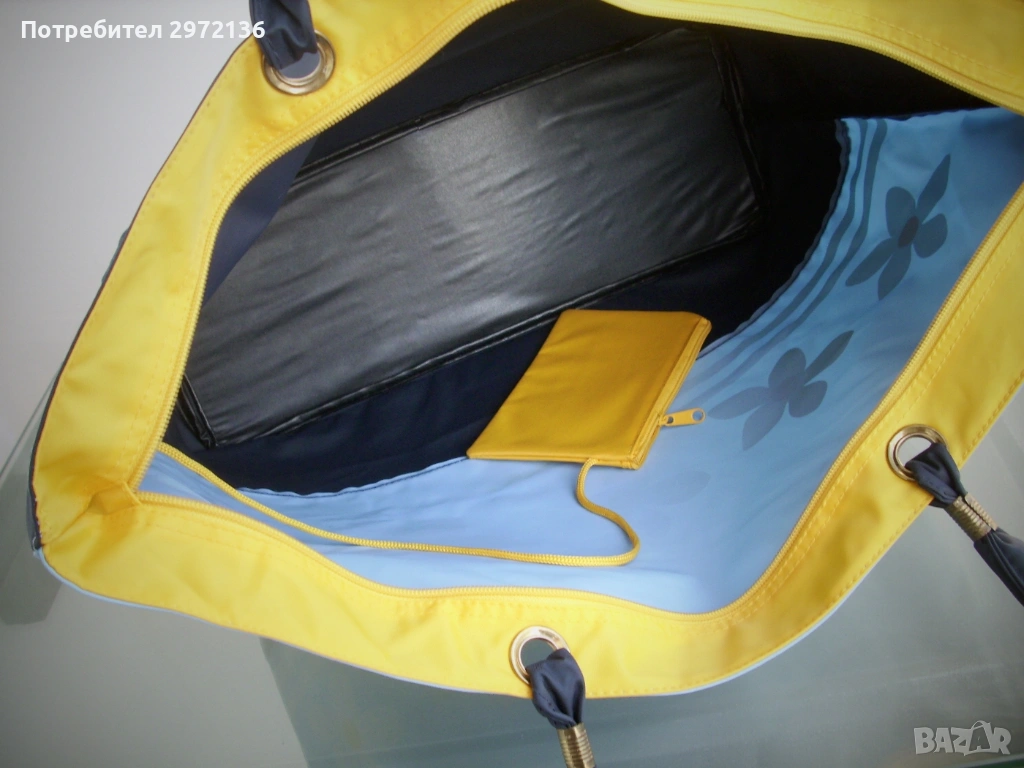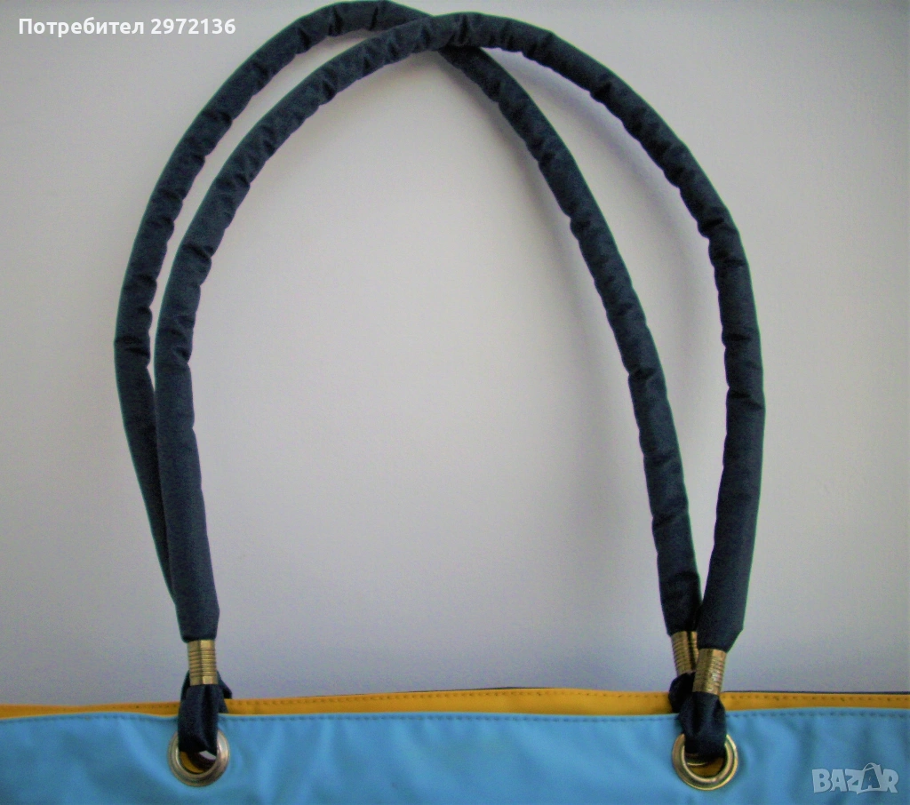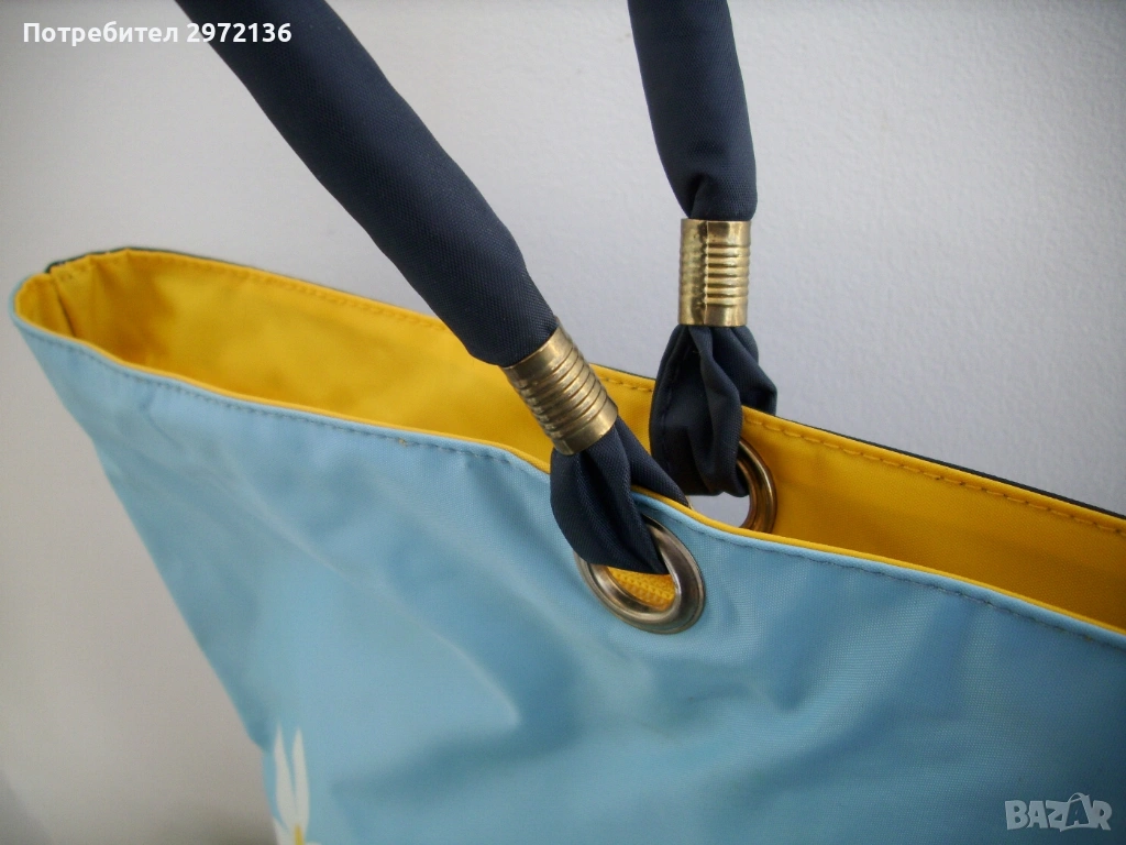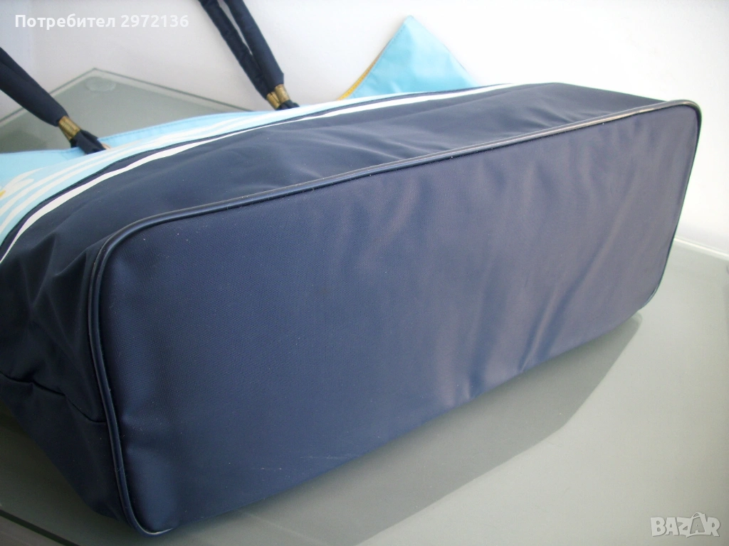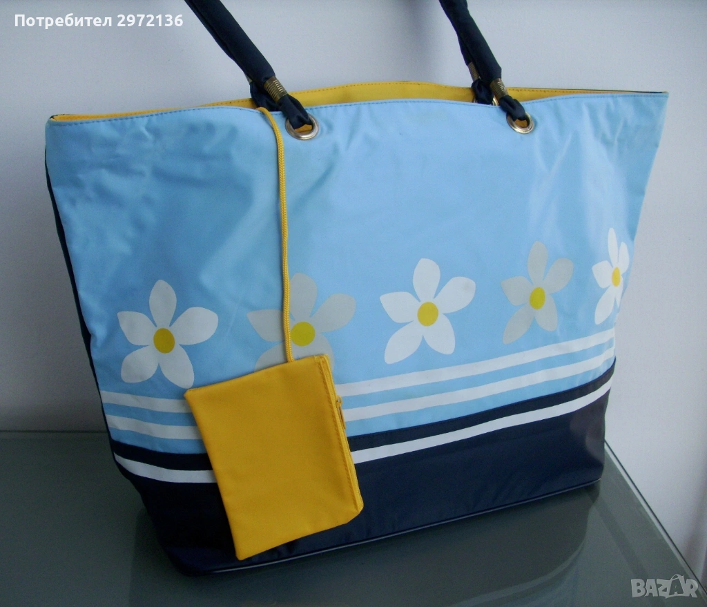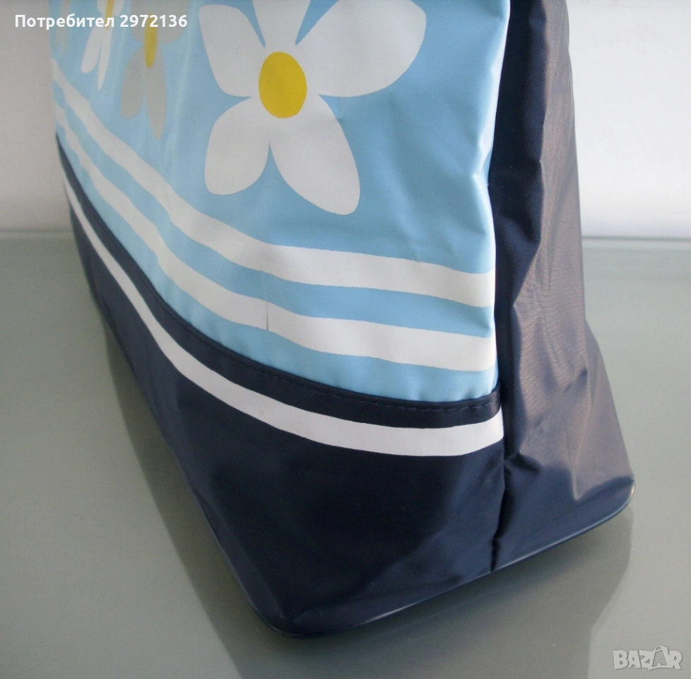 Голяма плажна чанта от непромокаем полиестерен плат. Цвят тъмносин и светлосин с бели цветя и райета.