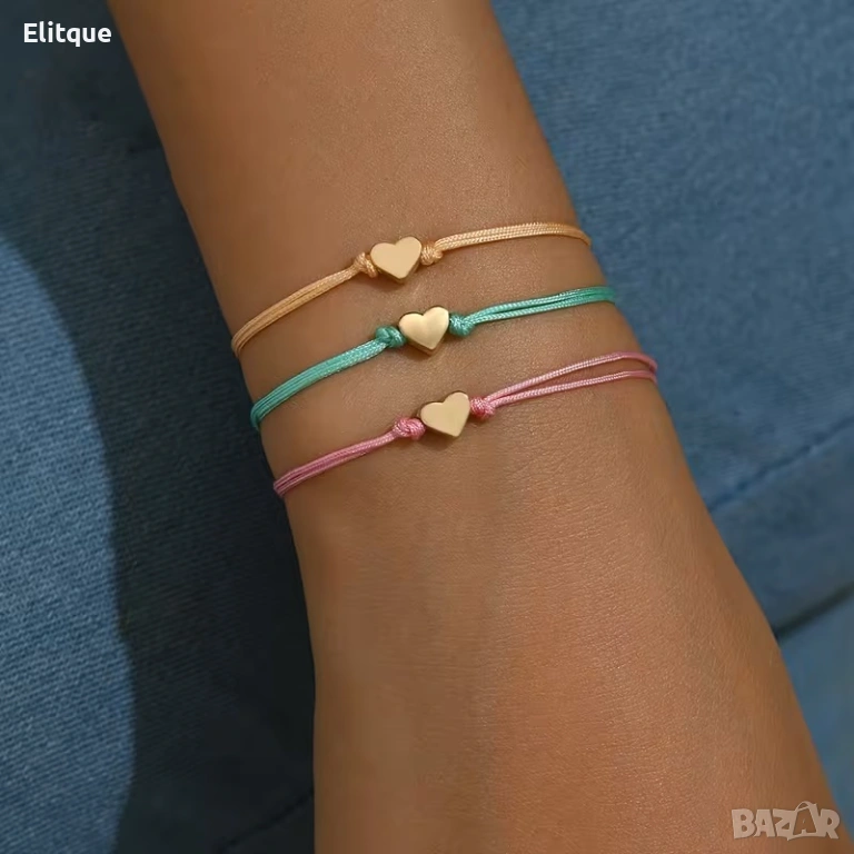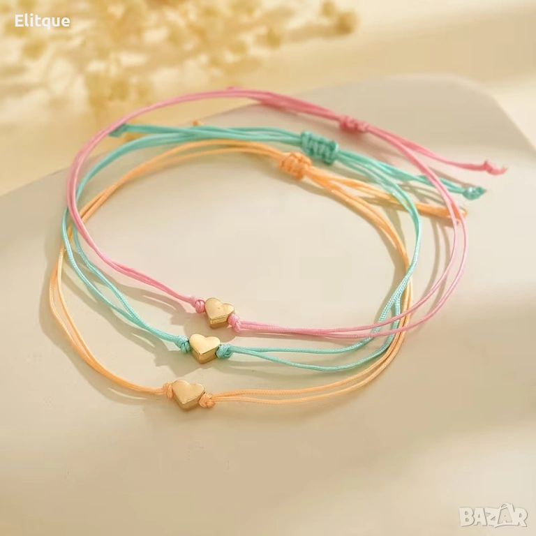 Този нежен комплект гривни със сърце е създаден като малък, но силен жест на обич, свързаност и внимание. Фините цветни шнурове са допълнени с деликатно метално сърце, което придава елегантен и универсален вид. Благодарение на регулируемата си дължина, гривните са удобни за ежедневно носене и подходящи за различни размери китка. Перфектен избор за подарък между приятели, влюбени или като символичен аксесоар с лично значение. Леки, дискретни и стилни – гривни, които носят емоция.