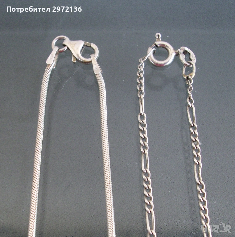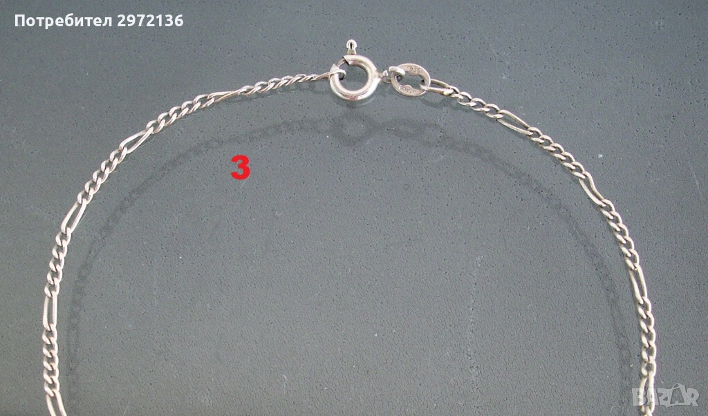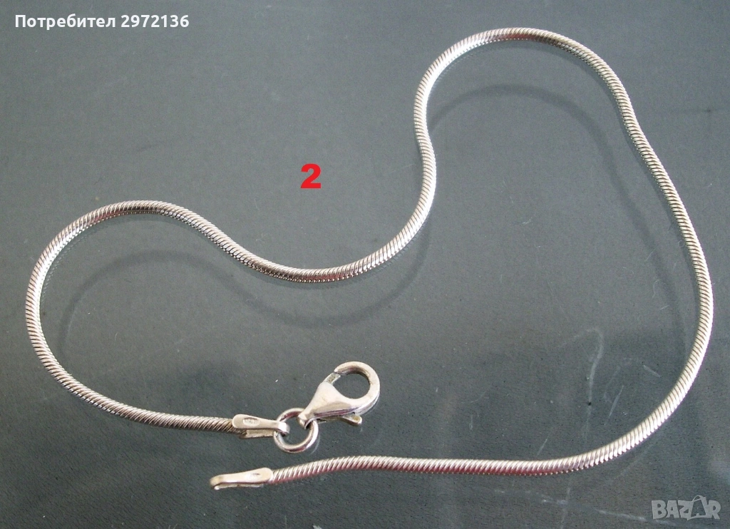 2. Гривна за ръка или глезен с визия на змийска кожа. Верижката е с кръгло сечение и блестяща повърхност. Сребро проба 925, двойна маркировка, Италия, дължина 22 см, ширина 2 мм, тегло 3.16 грама. Цена 35 €.