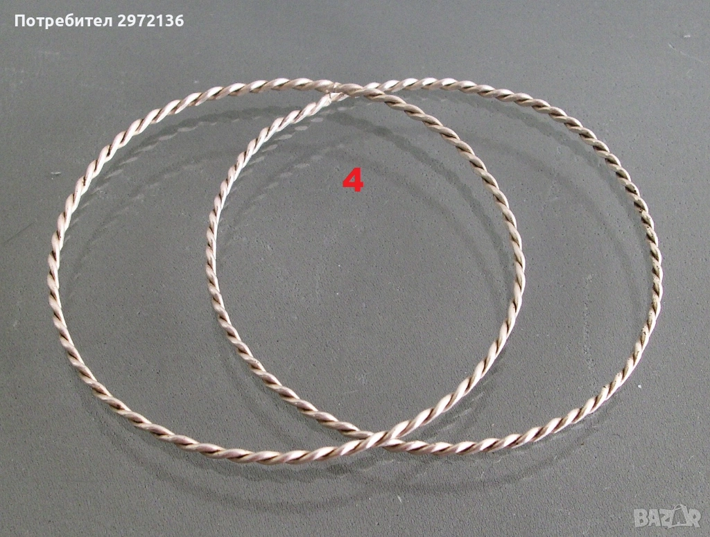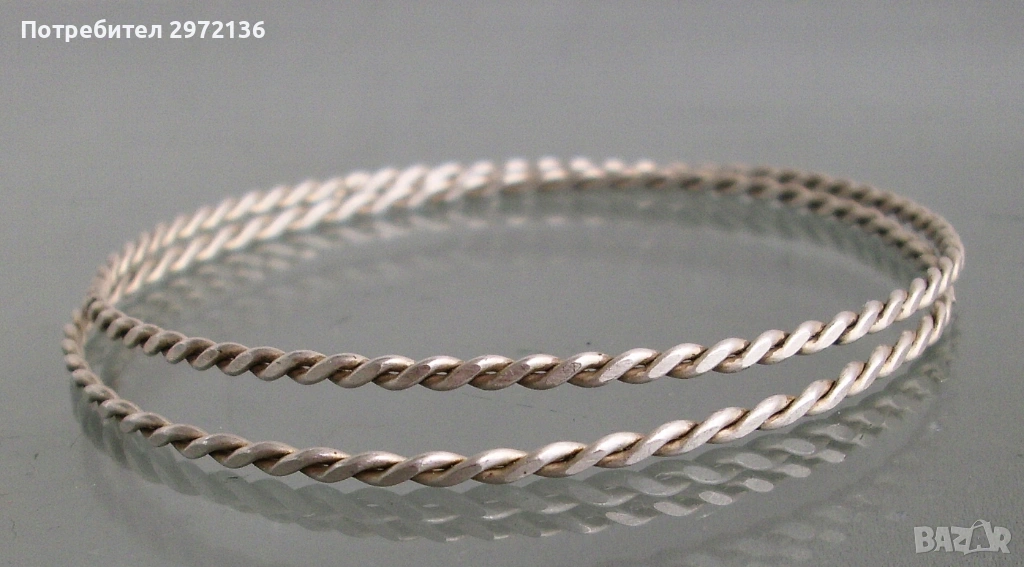 4. Комплект две твърди гривни, сребро проба 925, българско производство. Всяка гривна е изработена от две спираловидно усукани плоски ивици, шлифовани двустранно. Диаметър 65 мм, сечение 2 х 1.5 мм, тегло общо 3 грама. Цена 32 €.