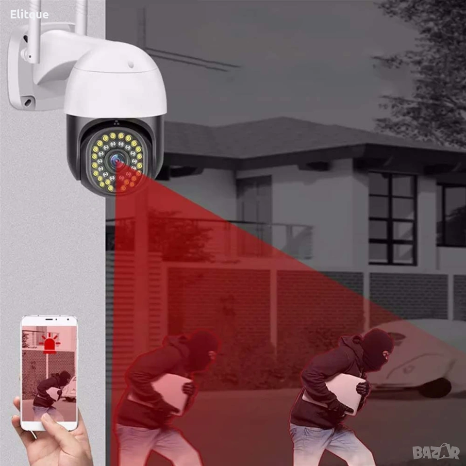 Wi-Fi Smart камера ULTRA HD за наблюдение с автоматично следене на движението, цветно нощно виждане и двупосочна аудио връзка с управление от всеки телефон (Android, Apple) или компютър. С нова подобрена матрица. Камерата разполага с изкуствен интелект, който автоматично засича човешката форма и моментално изпраща известие на смартфона Ви. Снабдена е с мотор и се завърта във всички посоки. Управлението става директно, чрез смартфона – отдалечено. Камерата изпраща нотификации при засичане на движение и звук, директно на смартфона, чрез приложението с което работи. PTZ управление: 355-градусово хоризонтално завъртане и 90-градусово вертикално, като по този начин обхваща по-голям периметър. Отлично качество на картината с реални 3mpx бленда.