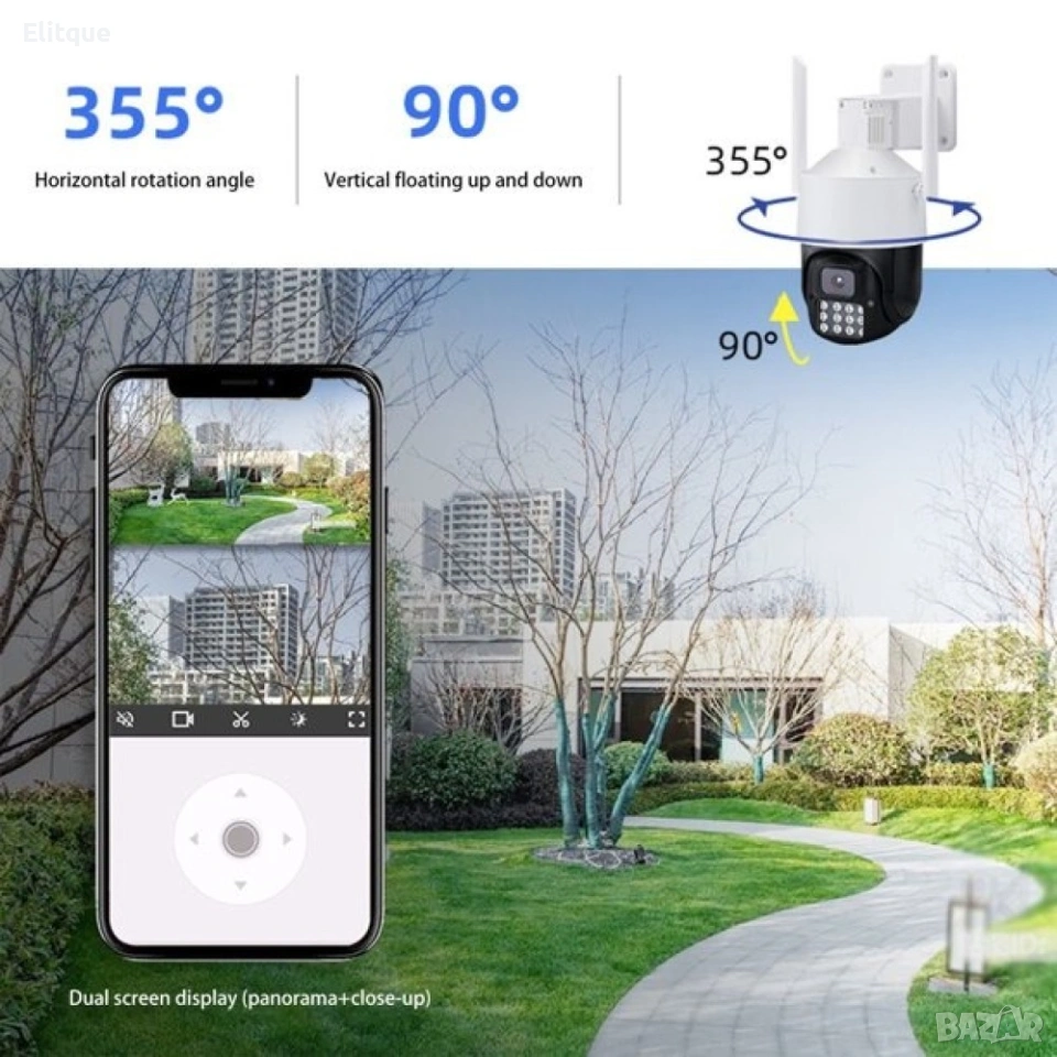 Wi-Fi камера за видеонаблюдение с автоматично следене на движението, цветно нощно виждане и двупосочна аудио връзка с управление от всеки телефон (Android, Apple) или компютър. Камерата е снабдена с мотор и се завърта във всички посоки. Управлението става директно, чрез смартфона – отдалечено. 355-градусово хоризонтално завъртане и 90-градусово вертикално, като по този начин обхваща по-голям периметър. Отлично качество на картината с реални 5mpx бленда. Камерата изпраща нотификации при засичане на движение и звук директно на смартфона чрез приложението, с което работи.
