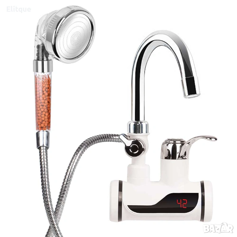 Смесителна батерия с вграден проточен бойлер за хоризонтален (стеннен) монтаж и подвижен турмалинов душ.