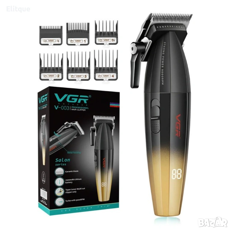VGR V‑003 е професионален тример с мощен мотор, самонаточващи се остриета и издръжлива литиево-йонна батерия. Остриетата от прахова металургия и керамика са проектирани така, че да не нагряват и не дразнят кожата при продължителна употреба. Машинката е подходяща за всички типове коса – гарантира плавно и прецизно подстригване без загуба на мощност.