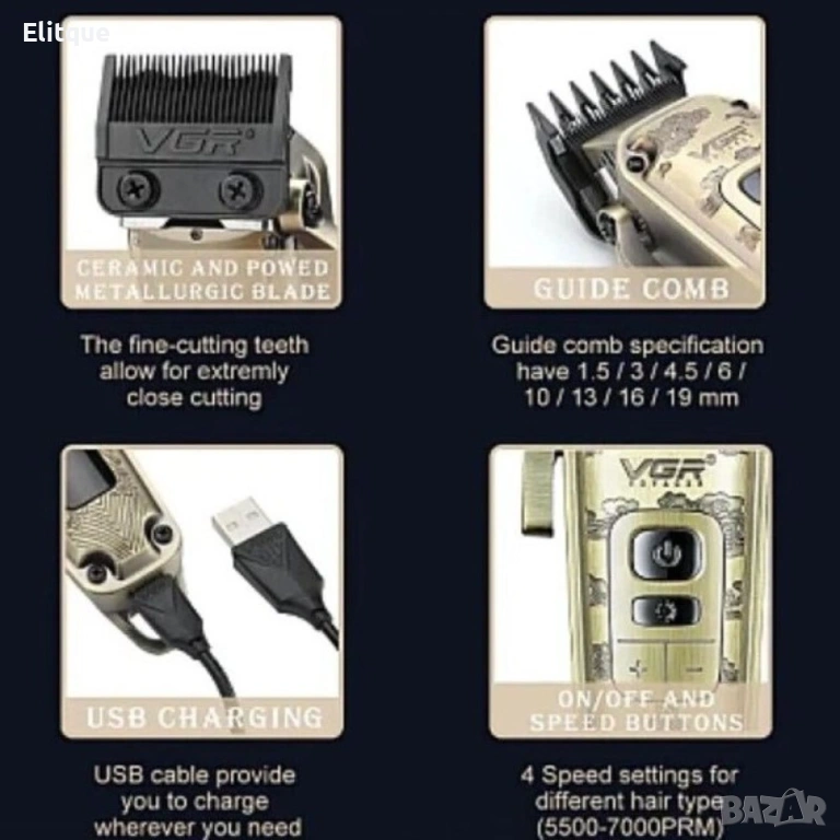 Акумулаторен тример, VGR V-005, метален корпус, 2600mAh батерия, LED дисплей, 8 разстояния, острие от неръждаема стомана, USB зареждане, златен