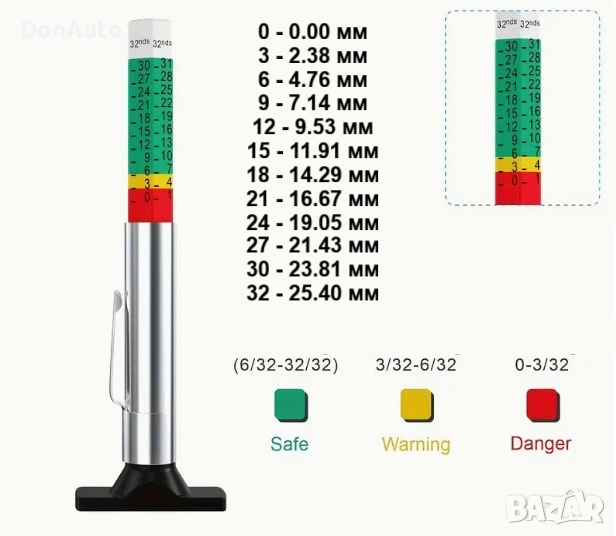 Дълбокомер за гуми – прецизен измервателен уред за дълбочина на грайфера (мм и инчове)