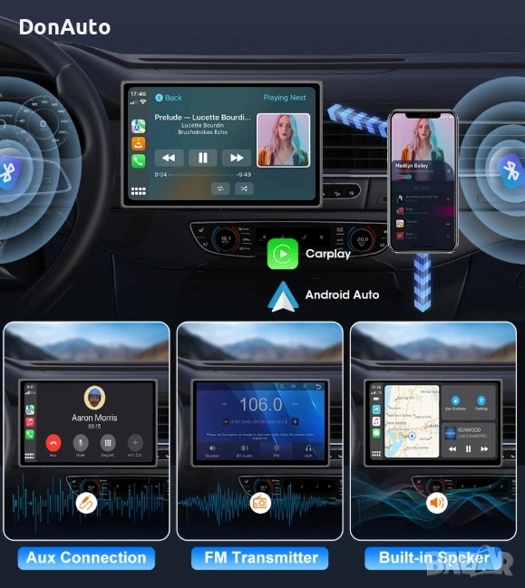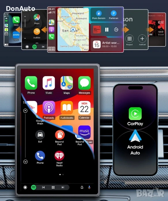 Поддържа безжично CarPlay и Android Auto, което ти позволява да свържеш телефона си лесно и безопасно – за навигация, музика, разговори или видео, без нужда от кабели.