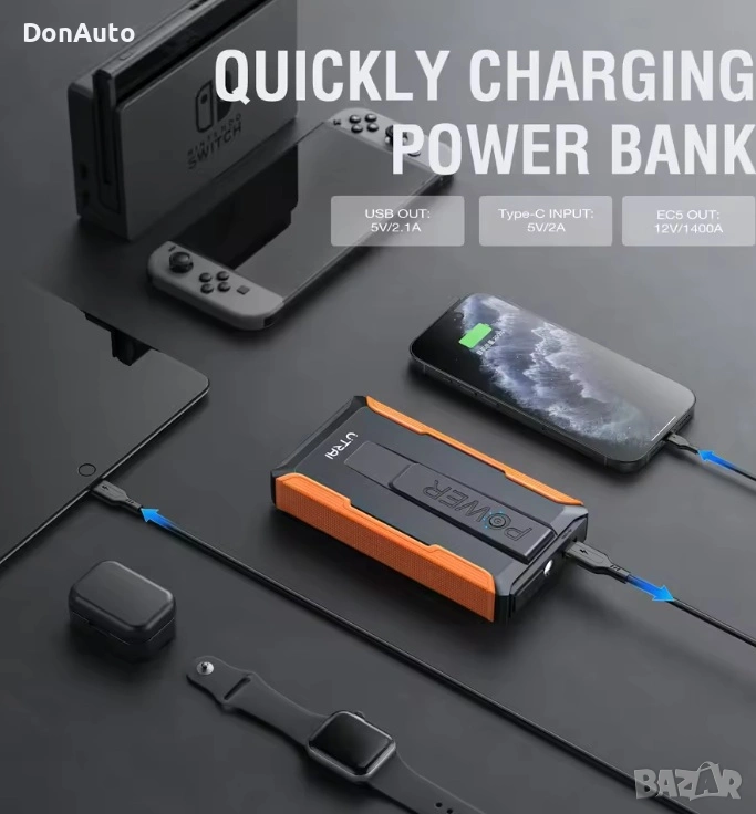 Стартерно/Пусково устройство 1400A – стартер за автомобил, портативна външна батерия 12V, Power Bank за спешни ситуации