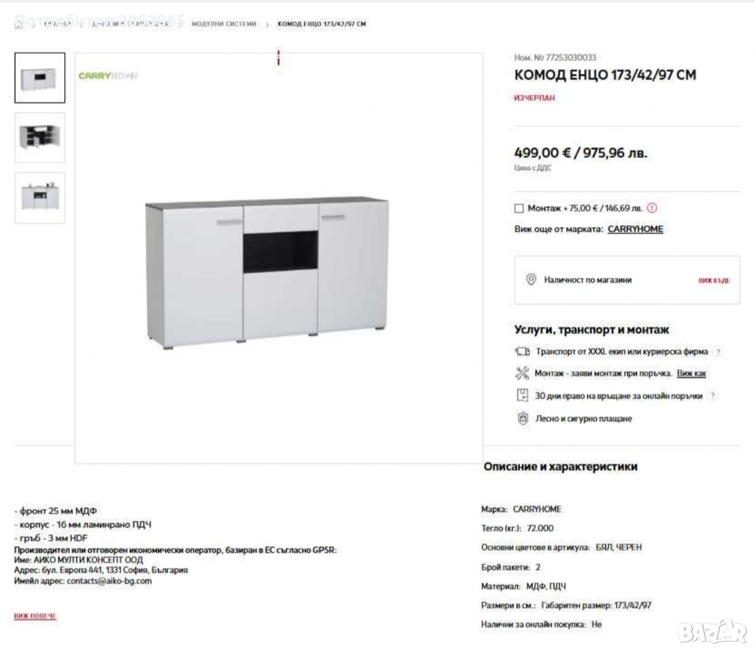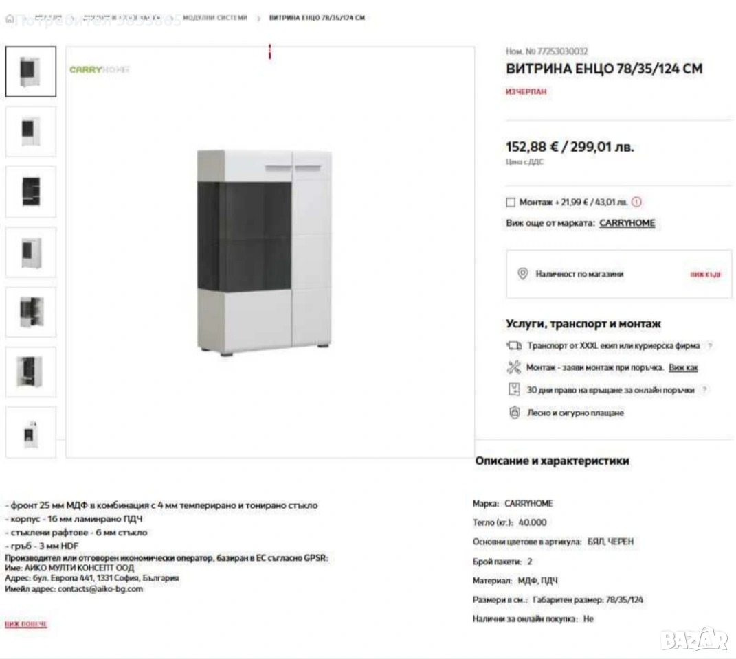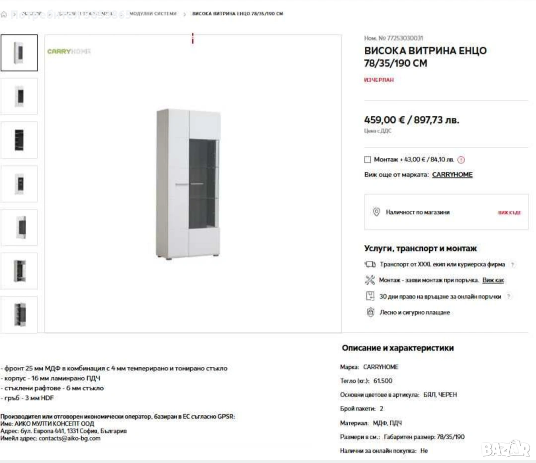 1. ВИТРИНА ЕНЦО 78/35/124 СМ 2. ВИСОКА ВИТРИНА ЕНЦО 78/35/190 СМ 3. КОМОД ЕНЦО 173/42/97 СМ Продават се всички заедно! В сглобено състояние. От дом на непушачи и без домашни любимци. Нормални следи от употреба. Транспорта се поема за сметка на купувача С лед освтление във витрините --- 1. ВИТРИНА ЕНЦО 78/35/124 СМ - фронт 25 мм МДФ в комбинация с 4 мм темперирано и тонирано стъкло - корпус - 16 мм ламинрано ПДЧ - стъклени рафтове - 6 мм стъкло - гръб - 3 мм HDF Mарка: CARRYHOME Тегло (кг.): 40.000 Основни цветове в артикула: БЯЛ, ЧЕРЕН Материал: МДФ, ПДЧ --- 2. ВИСОКА ВИТРИНА ЕНЦО 78/35/190 СМ - фронт 25 мм МДФ в комбинация с 4 мм темперирано и тонирано стъкло - корпус - 16 мм ламинрано ПДЧ - стъклени рафтове - 6 мм стъкло - гръб - 3 мм HDF Mарка: CARRYHOME Тегло (кг.): 61.500 Основни цветове в артикула: БЯЛ, ЧЕРЕН Материал: МДФ, ПДЧ --- 3. КОМОД ЕНЦО 173/42/97 СМ - фронт 25 мм МДФ - корпус - 16 мм ламинрано ПДЧ - гръб - 3 мм HDF Mарка: CARRYHOME Тегло (кг.): 72.000 Основни цветове в артикула: БЯЛ, ЧЕРЕН Материал: МДФ, ПДЧ Размери в см.: Габаритен размер: 173/42/97