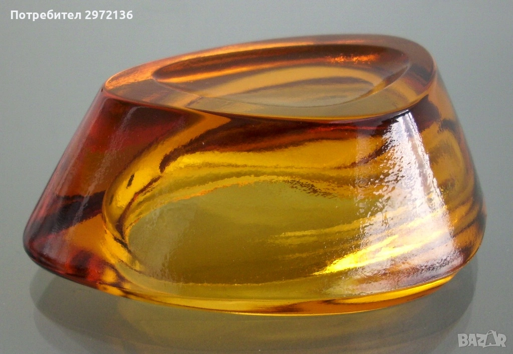 Снимки 1-3: Масивен пепелник от дебелостенно цветно лято стъкло, размери 11,5-8 см, височина 4 см, тегло 200 грама, цена 17 €;