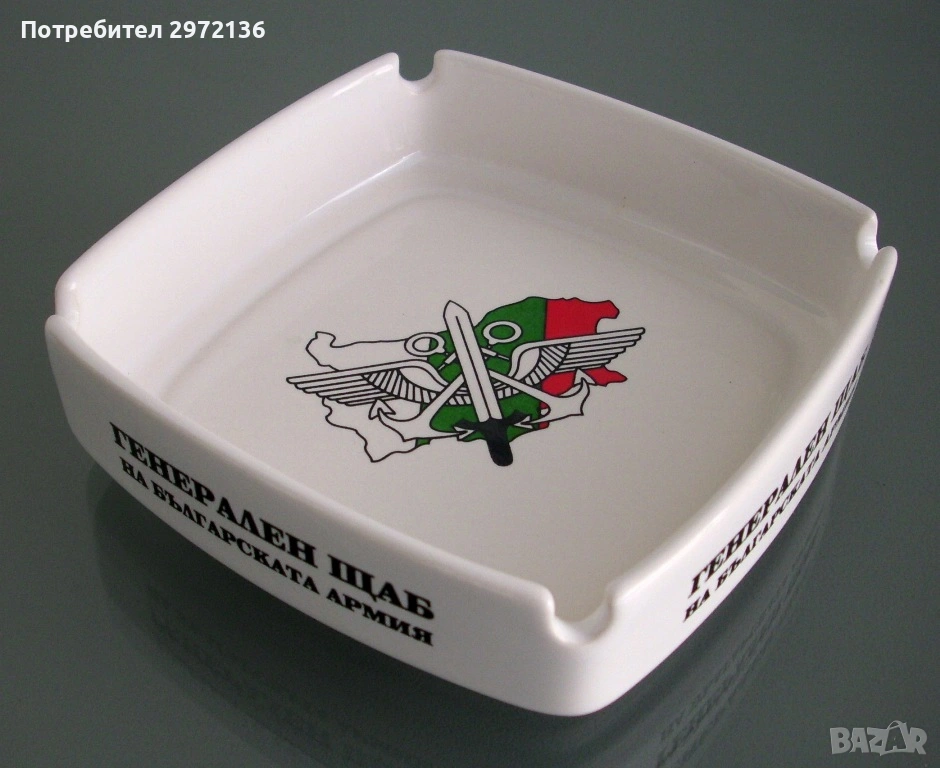 Снимка 10: Порцеланов рекламен пепелник с логото на Генералния щаб на Българската армия, с квадратна форма 11х11 см, височина 3,3 см, продаден;