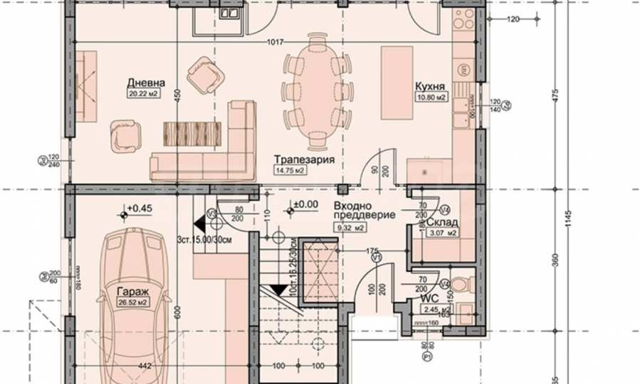 Къща разполага с гараж / 26.52 кв.м/ паркомясто.