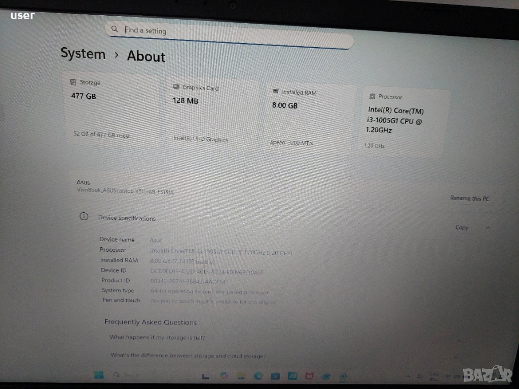 15.6" лаптоп като нов Asus Vivobook F515J Core i3-1005G1 8GB RAM 512GB SSD → Обява 53130560