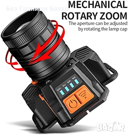 Супер ярък LED челник с 3 режима на бяла светлина: силен, слаб, мигащ