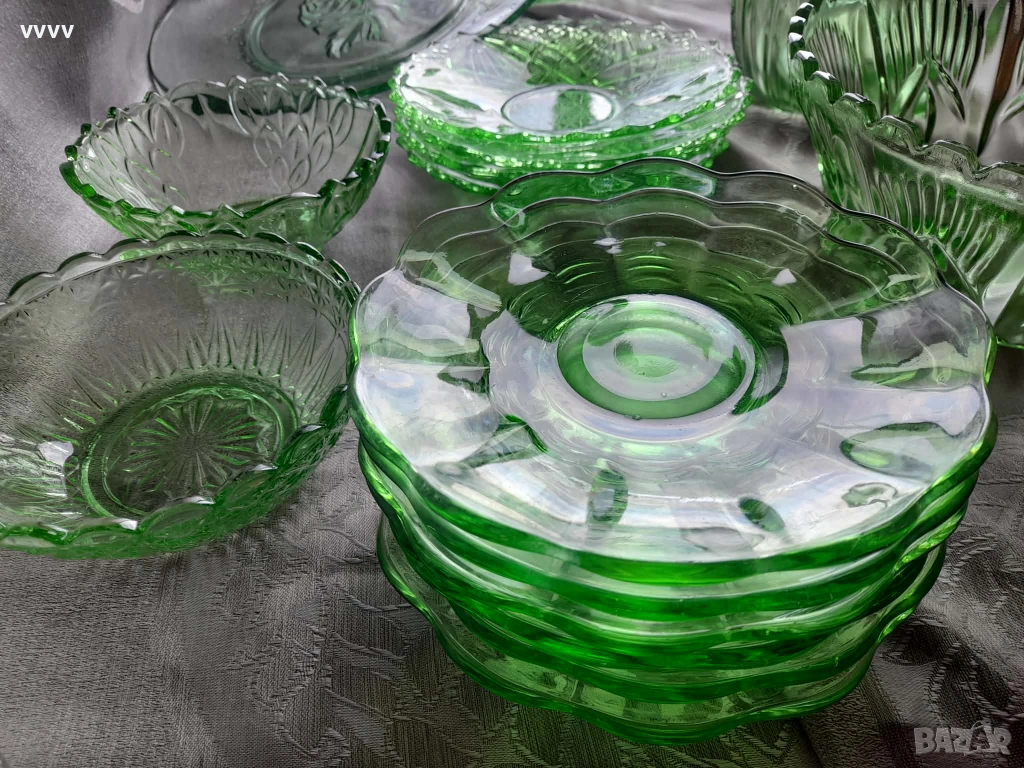 Купи, фруктиера, големи чинии, малки чинии от зелено стъкло