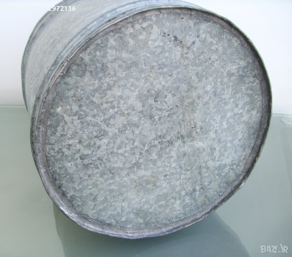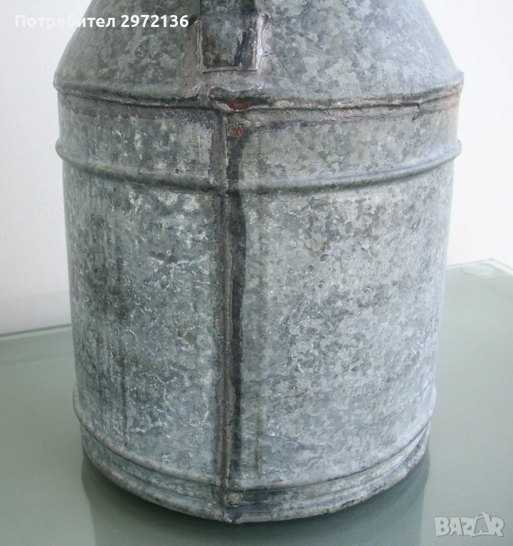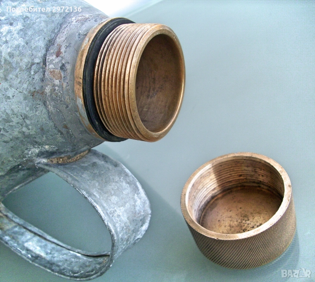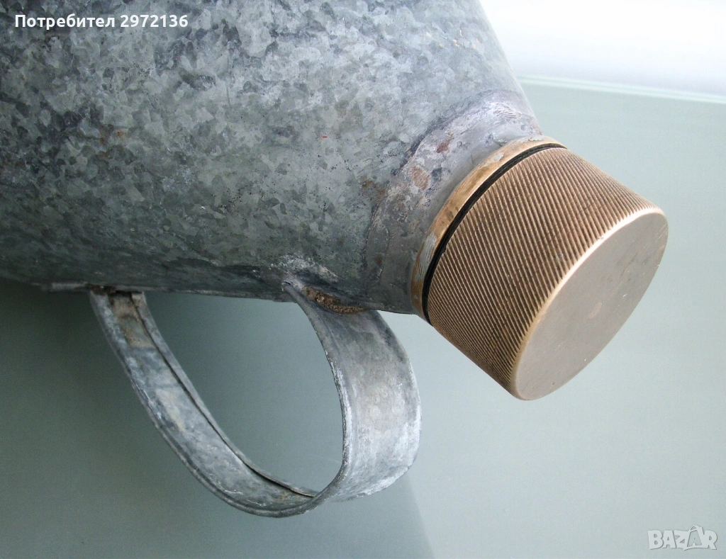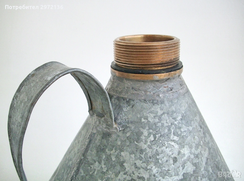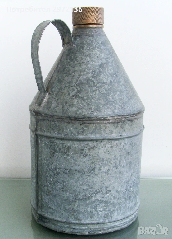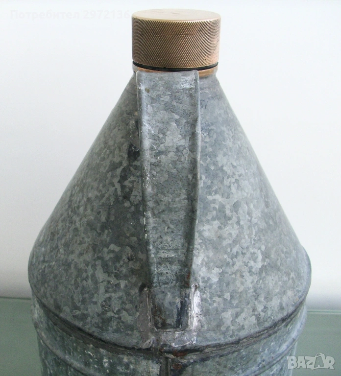 Метална туба за гориво с вместимост 8 литра. Изработена от дебела поцинкована ламарина с херметична бронзова капачка на винт. Напълно здрава и функционална, отлично състояние. Използвана е за съхранение на бензин. Височина 36 см, диаметър 20 см.