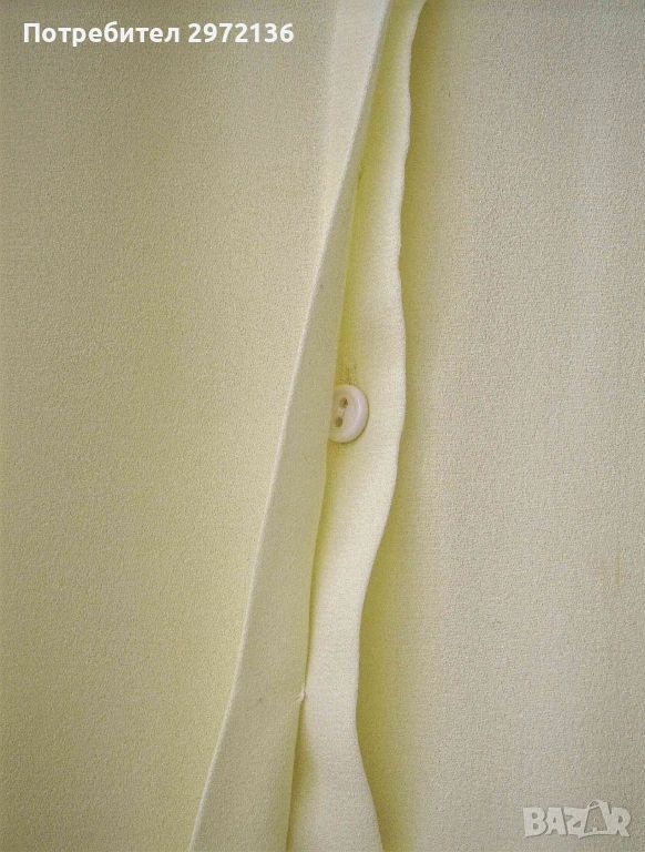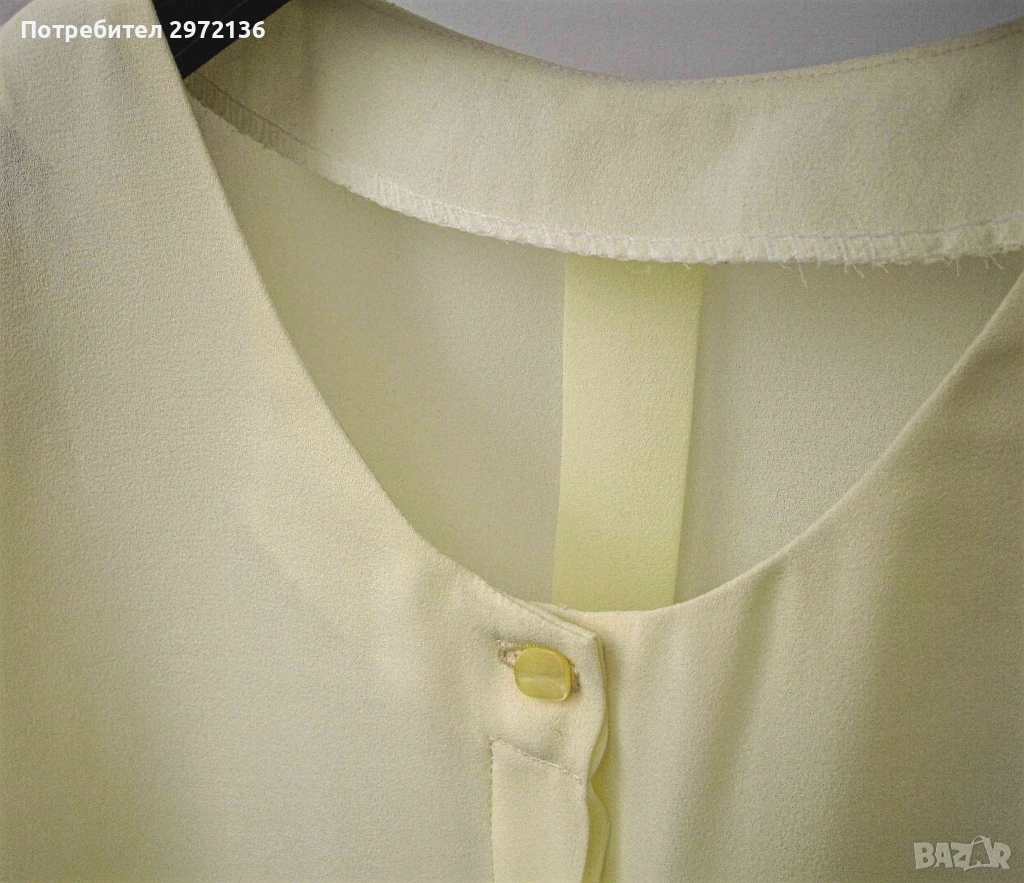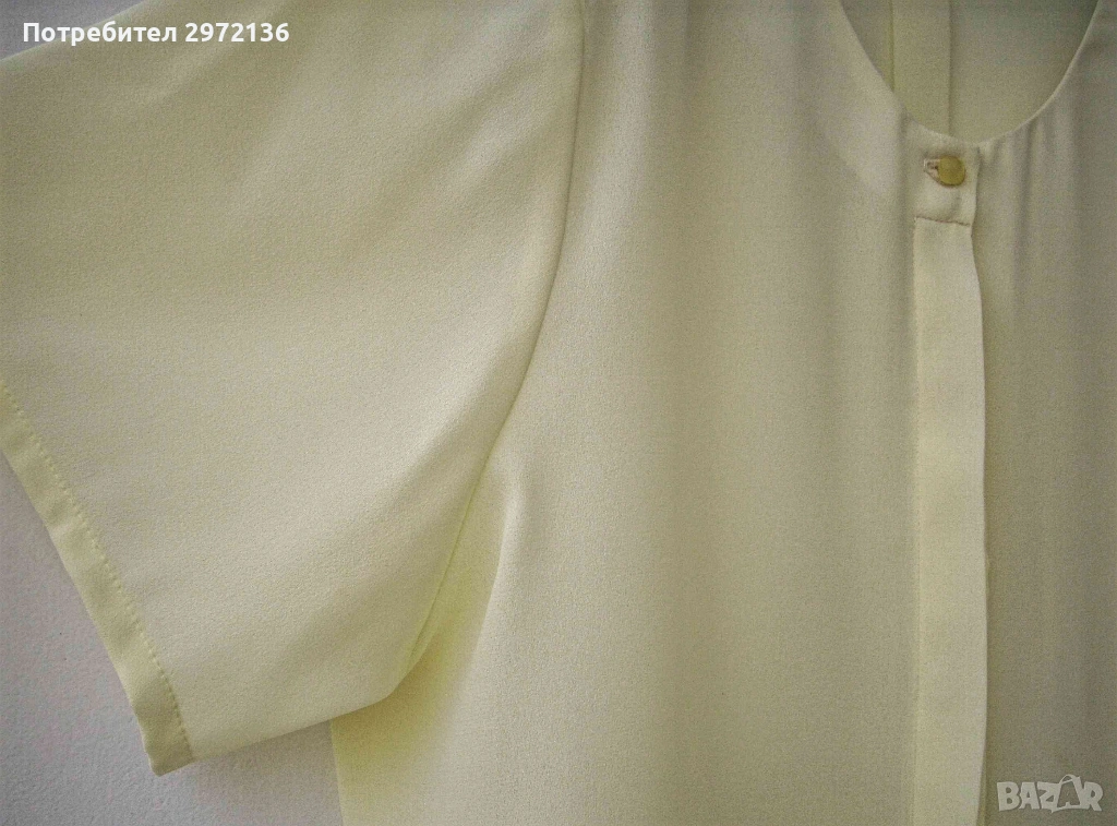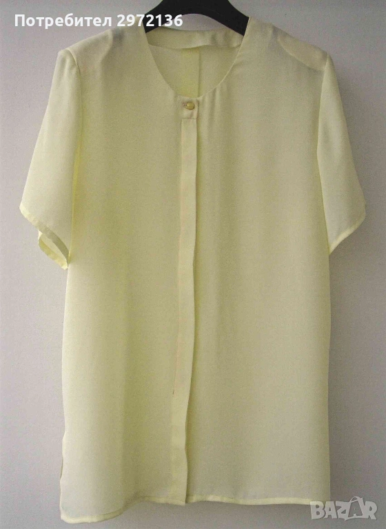 Дамска блуза с обло деколте и къси ръкави, цвят бледо жълт. Материята е полупрозрачна, ефирна и пада тежко. Ако се суши на закачалка може да не се глади. Силуетът е прав, подчертано елегантен. Закопчаването е скрито. На раменете има вградени подплънки, ръкавите са прави. Страничните шевове не са зашити до края, което е удобство, ако блузата се носи като туника. На гърба има оформящ шев, който не е рязан. Състав на плата 100% полиестер. Размери на блузата: дължина 70 см, гръдна обиколка 108 см, рамо 12 см, ръкав дължина 23 см, ръкав ширина в края 21 см. Дължина на закопчаването 58 см.