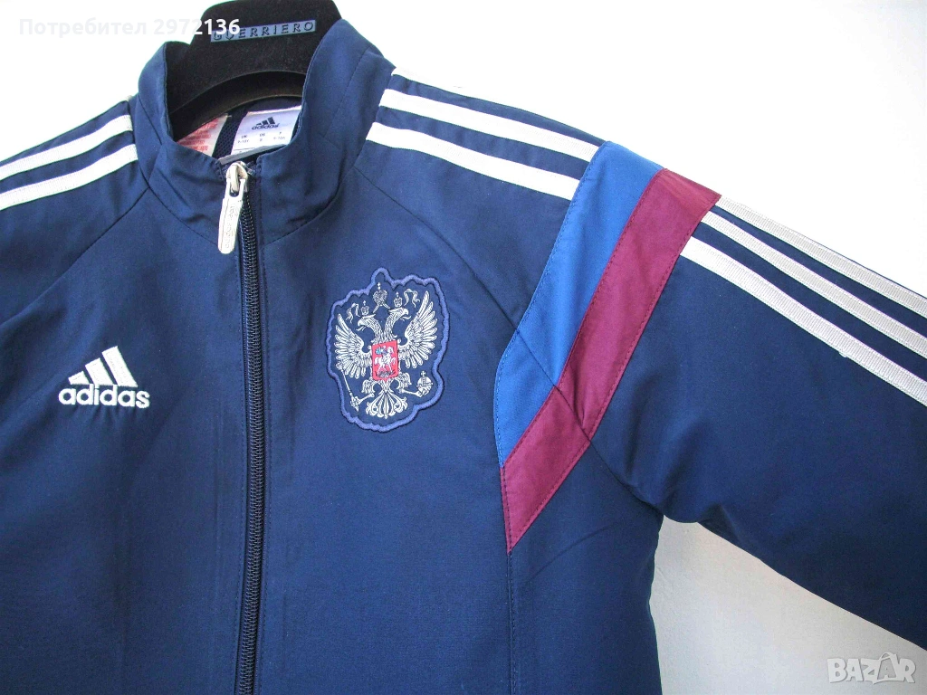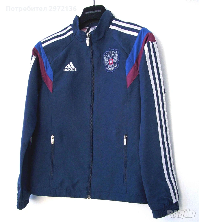 Детско яке, част от представителния екип на Adidas за Руския футболен съюз за 2015 година (G89090). Основен цвят тъмно син, с декоративни ленти по раменете и ръкавите в цветовете на руския национален флаг - бяло, синьо и червено. Отпред са бродирани емблемата на Adidas и герба на Руската федерация.