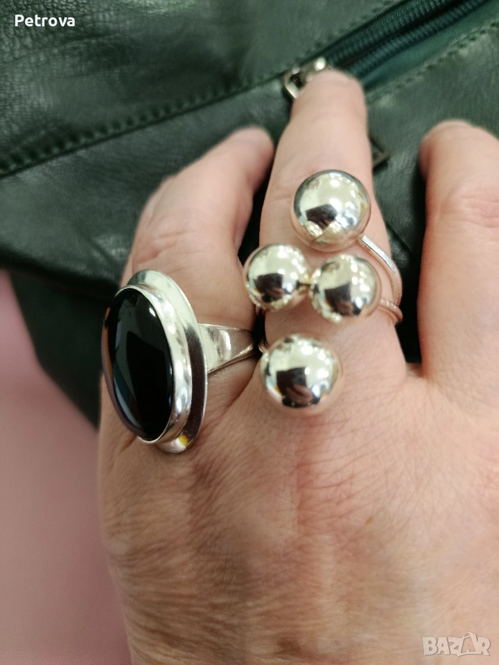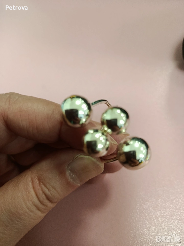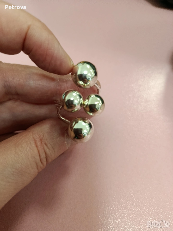 Масивен оригинален сребърен пръстен с топчета. Диаметър на големите топчета 1,2 см. Диаметър на малките топчета 0,9 см. Предимството на този модел е, че големината може лесно да се регулира, както и конфигурацията на топчетата - могат да се подредят и по друг начин. В момента ширината на халката е 1,9 см. Стои много ефектно на ръката.