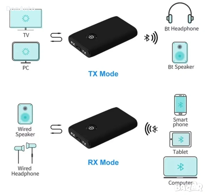 TX (Transmitter): предава аудио от телевизор или компютър към Bluetooth слушалки или колони.