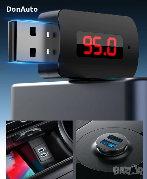 Свързва се лесно – просто го постави в USB порта на автомобила, избери FM канал и го свържи с телефона.