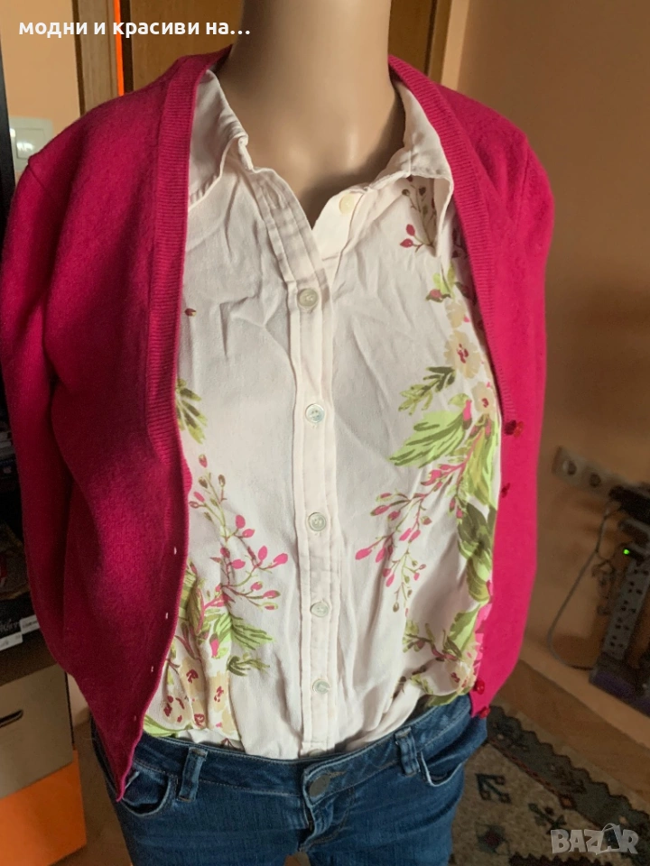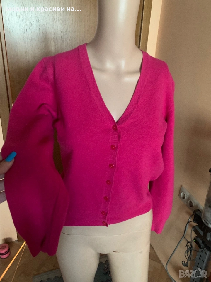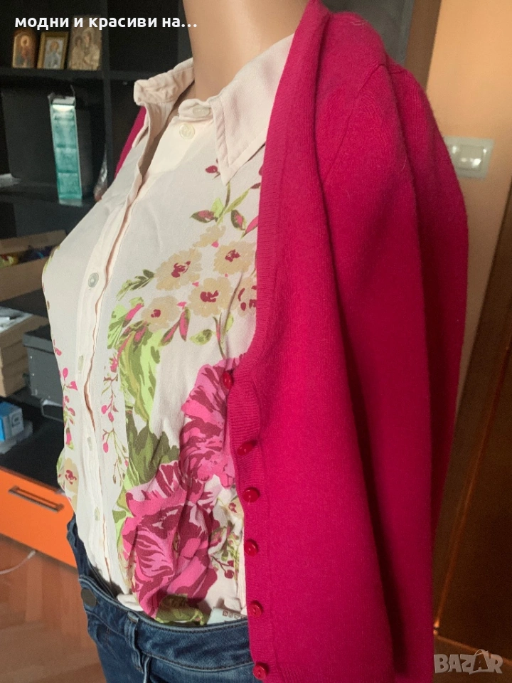 Моделът е кропнат. Подходящ за панталон с висока талия, както и да се носи над риза, рокля. Когато дрехата под жилетката има нюанс фуксия стои невероятно.