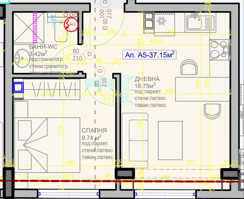 Жилището с обща площ от от 45 кв.м е разположено 2-ри и има следното разпределение:
