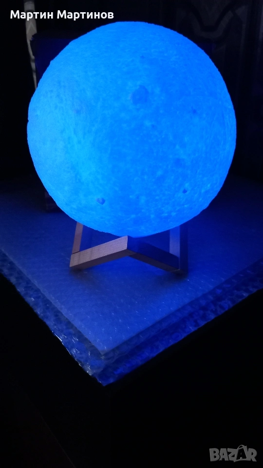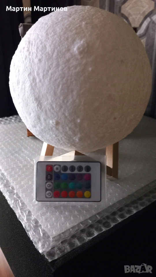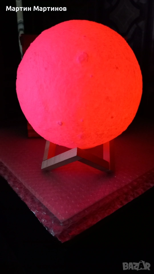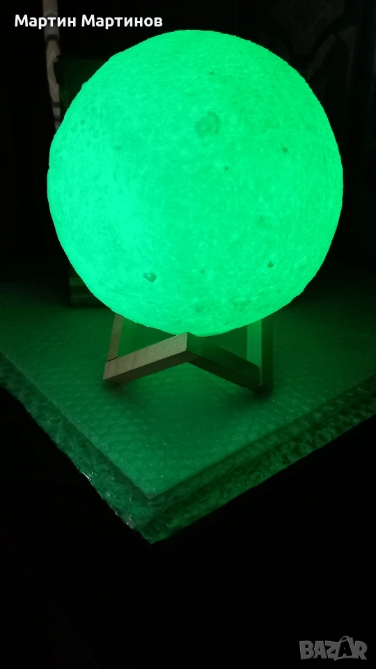 Нова /Неупотребявана/ Акумулаторна Настолна лампа - 3D MOON LIGHT - Диаметър - 20 см. Дистанционно и дървена стойка. Сменя цветовете и в такт с музика. Ефектна и стилна създаваща уютна атмосфера