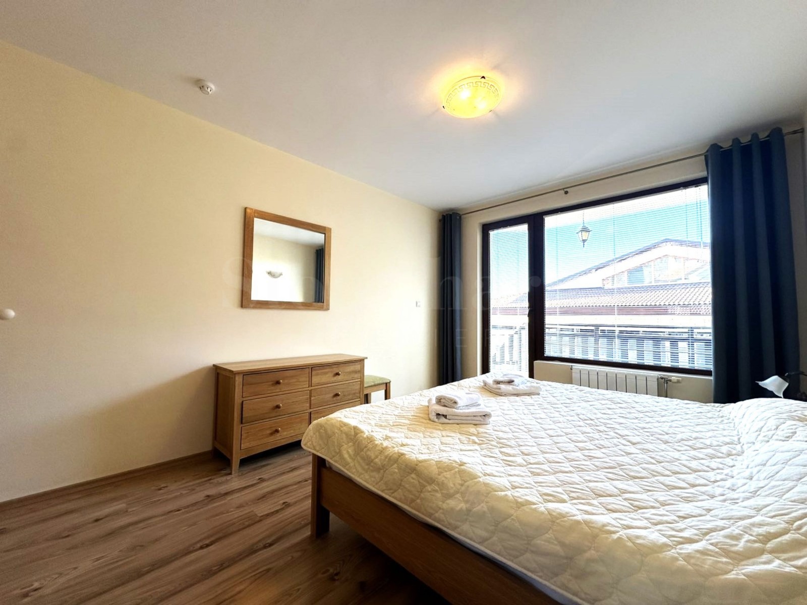 Мебели и оборудване: Всекидневна с оборудван кухненски бокс с кухненски шкафове, вградена фурна, керамичен котлон, абсорбатор, хладилник, маса за хранене със столове, ъглов диван, телевизор с шкаф за него. Спалня с двойно легло, две нощни шкафчета, двоен гардероб и огледало. Банята е с душ кабина, мивка, огледало и тоалетна.