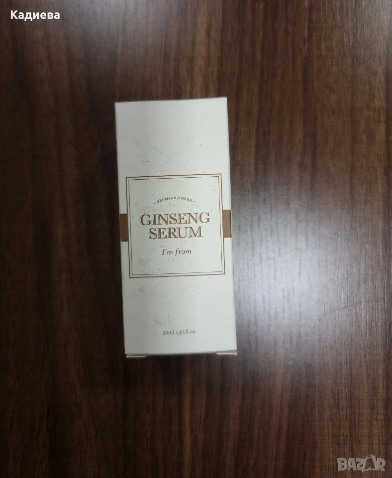 - I'm From Ginseng Serum- подобрява тонуса, интензивно хидратира и придава еластичност на кожата, борейки се с фините линии и бръчки. Женшенът стимулира производство на колаген. Без изкуствени оцветители, парабени, сулфати, животински продукти, алкохол и минерални масла. Количество: 30 ml. Купуван е за 58,99лв , продавам го за 21€.