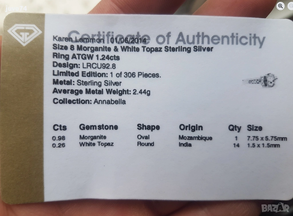 СРЕБЪРЕН ПРЪСТЕН С МОРГАНИТ (МОЗАМБИК) СЕРТИФИКАТ