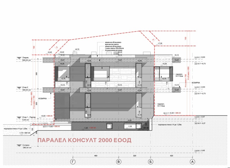 Фасадата е изпълнена изцяло с каменна облицовка съчетаваща врачански камък и Slim Stone.