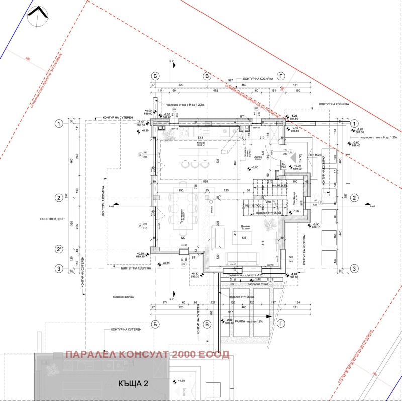 2-ро ниво: входно антре и стълбище, дневна с трапезария и кухня, тераса.