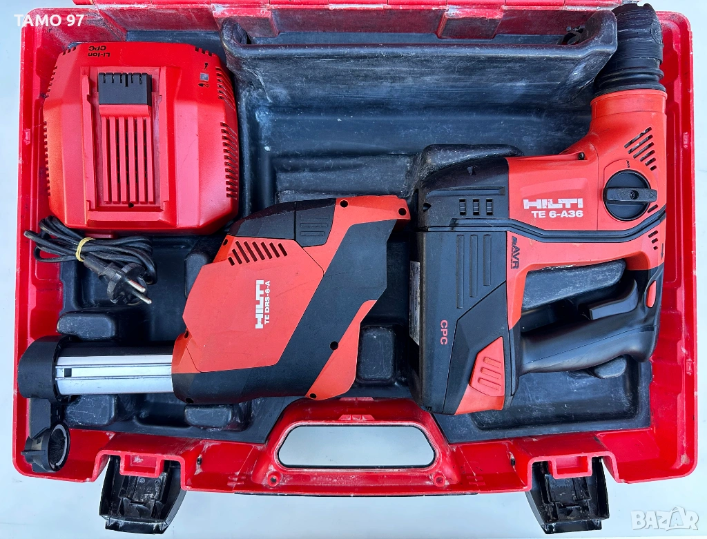 Продавам мощен акумулаторен перфоратор на Хилти с прахоуловител в отлично визуално състояние и работи перфектно. козметични следи от използването, но работи отлично всичко внос от Франция. Обявената цена включва перфоратор, прахоуловител, една батерия 36V 3.0Ah с индикатор, бързо зарядно с охлаждане и оригинален куфат. При желание на клиента може и без зарядното само машината с батерията за 300лв. Пращаме с опция преглед и тест с куриерска фирма еконт може и лично предаване за гр. Шумен.