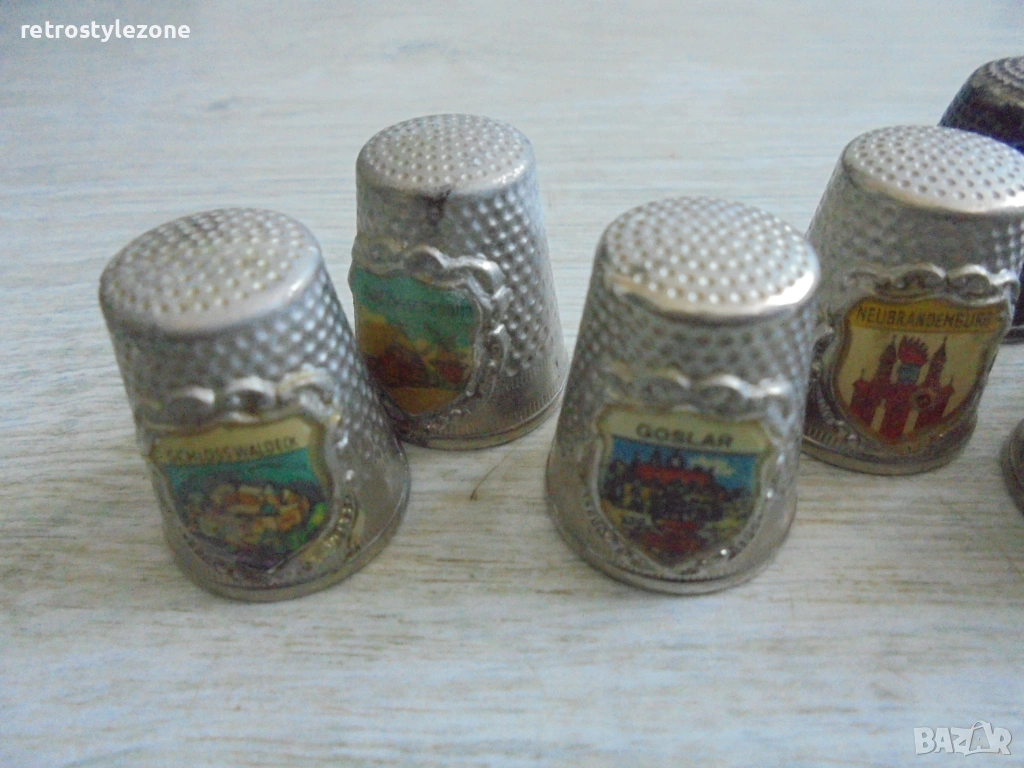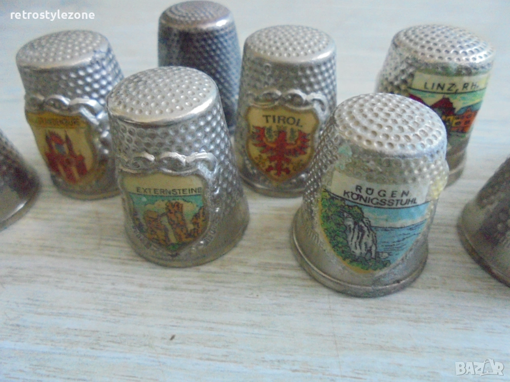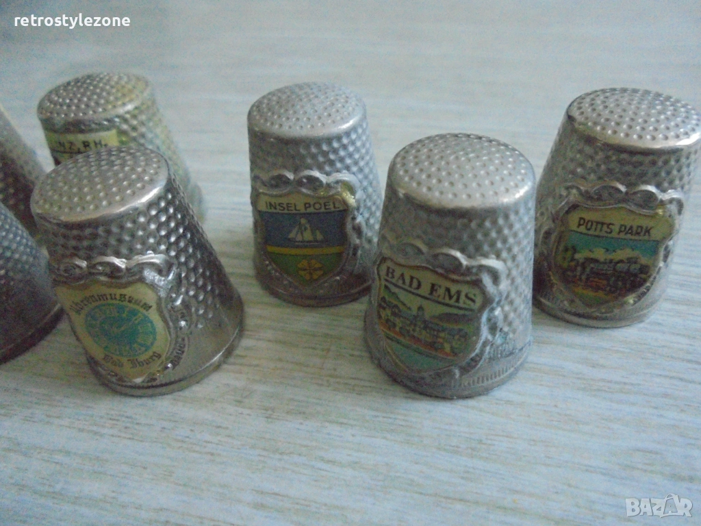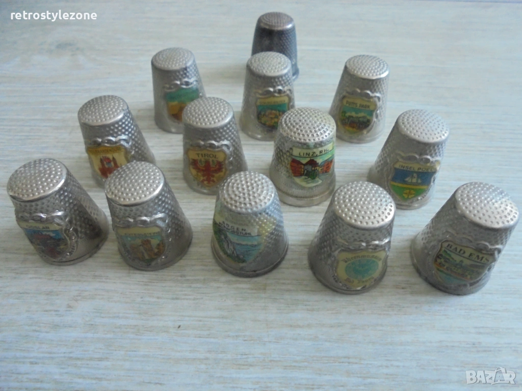 Комплект от 13 броя стари метални напръстника, с различни декоративни орнаменти, гербове, надписи и градове. Подходящи за колекционери, витрина или винтидж декорация.