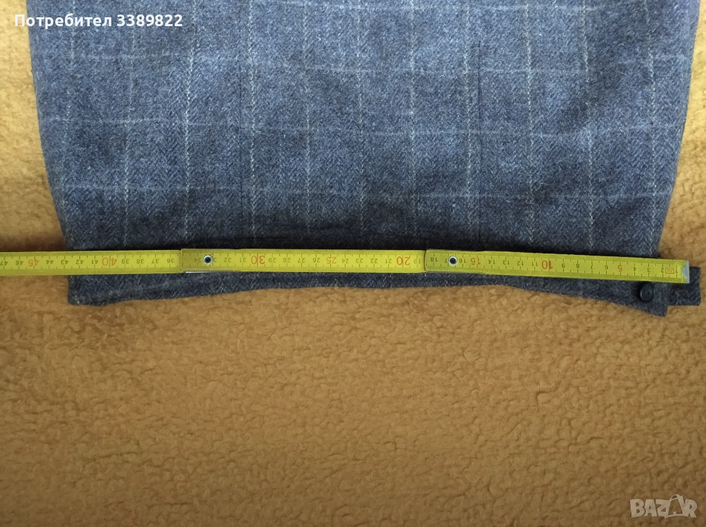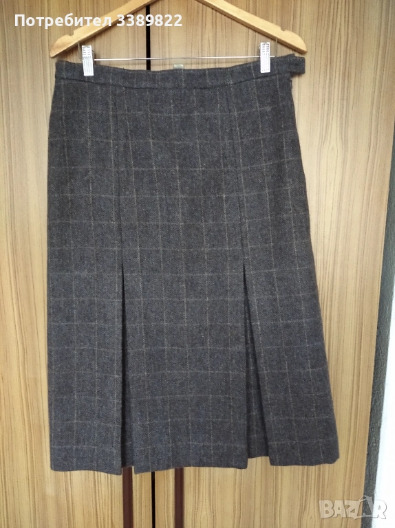 Пола - каре, цвят - сиво с бежова нишка, плат - шотландска вълна, дълга, с две плохи отпред и отзад, закопчава се с цип и копче отстрани, има вътрешна подплата, дължина 74см, талия едностранно около 43см.