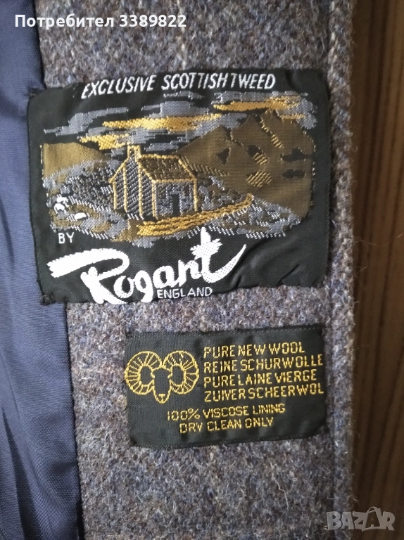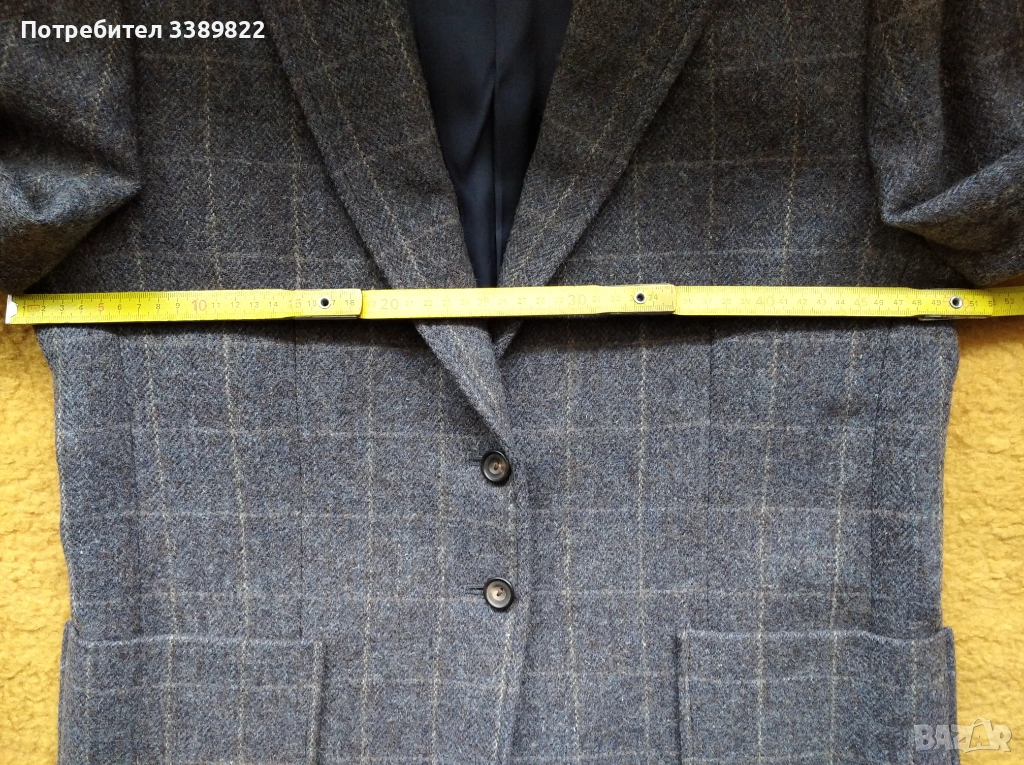 Сако - каре, цвят - сиво с бежова нишка, плат - шотландска вълна, леко вталено, закопчава се с копчета, два предни джоба, на ръкавите има копчета. Дължина от рамото до долу 67см, дължина на ръкава 63см, гръдна обиколка едностранно около 51см.