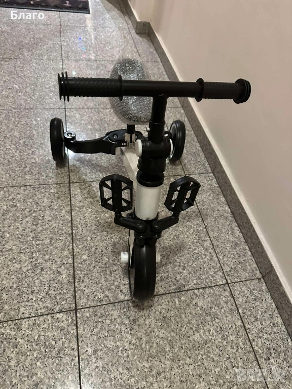 Триколка с бутане с крачета - след това може да поставите педалите от двете страни на предното колело