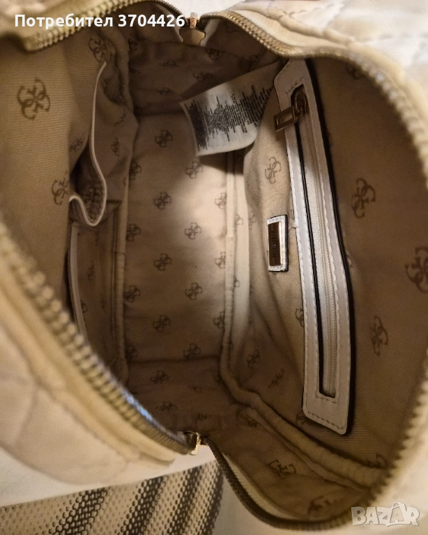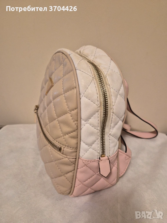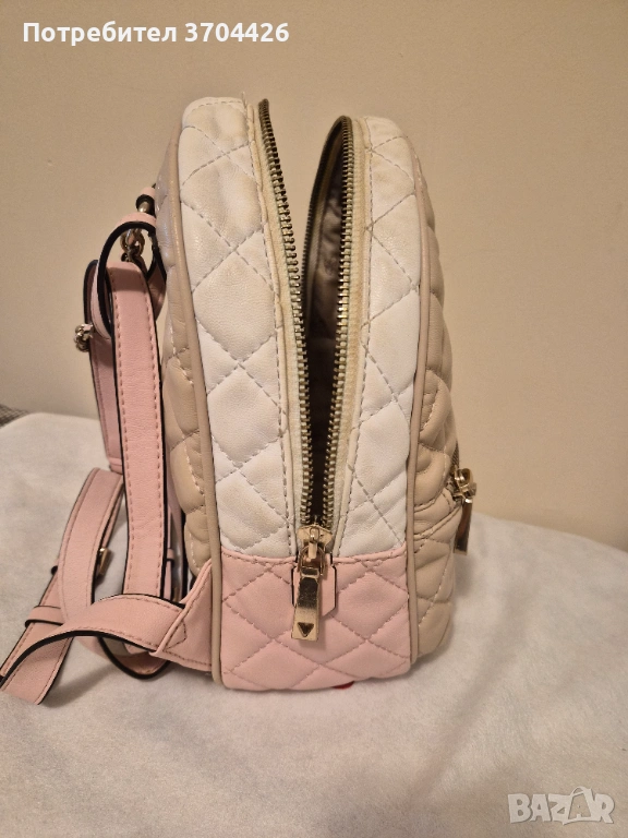Дамска раница GUESS. Изкуствен материал, единктвена забележка / има пожълтявания при белия цвят / . Няма обелване и напукване, нито скъсани места. Възможен коментар на цената.