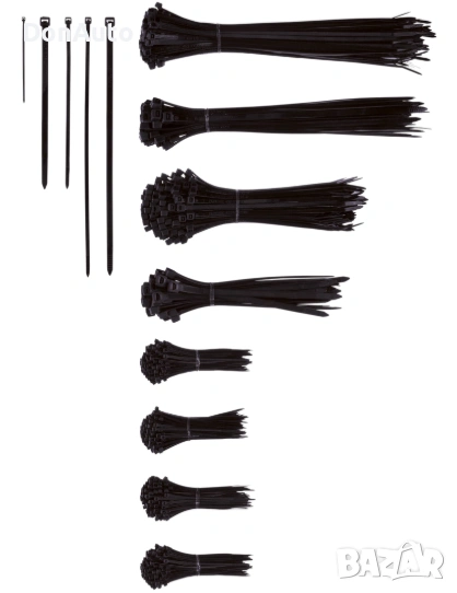 Комплектът съдържа кабелни превръзки в различни дължини и дебелини, подходящи за широк спектър от приложения – от домашни проекти до професионални монтажи.
